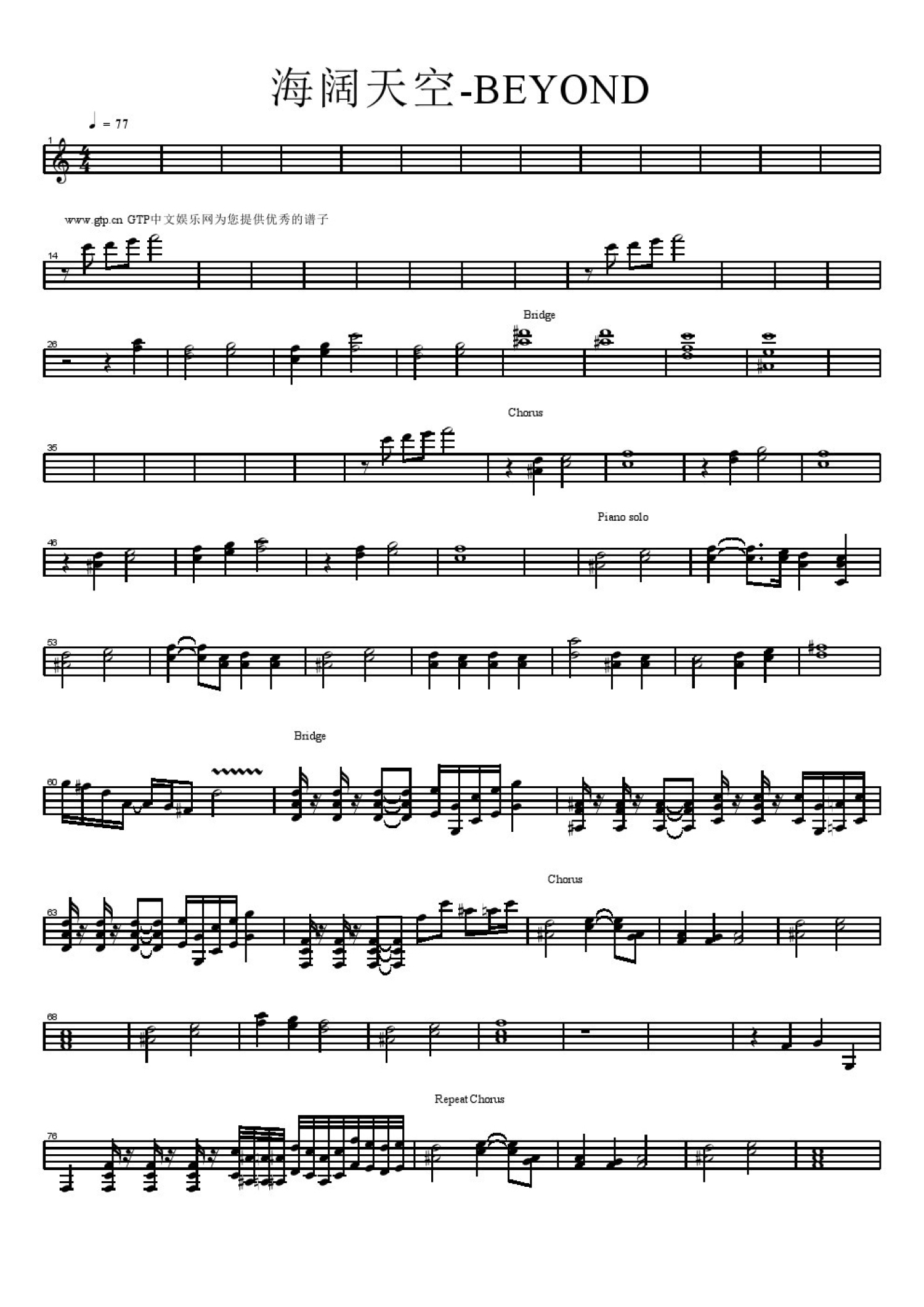 海阔天空钢琴谱 - BEYOND - 键盘谱