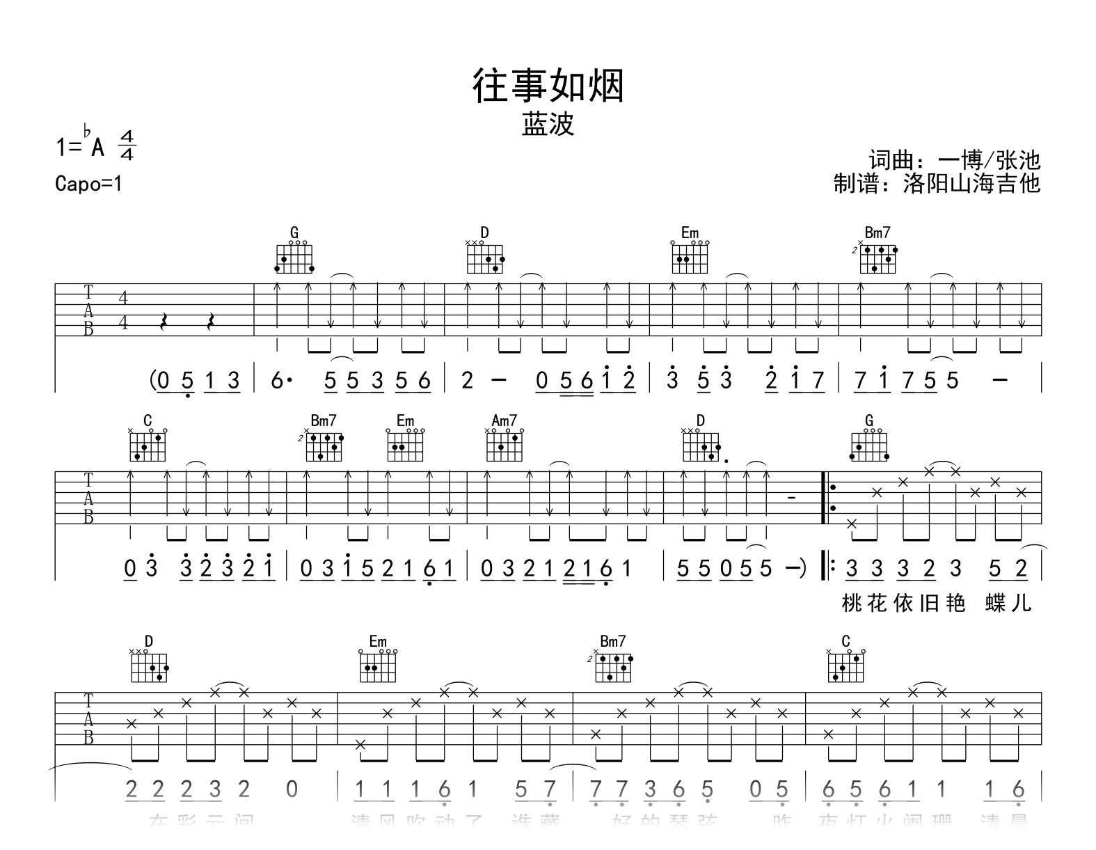 曲谱介绍: 往事如烟吉他谱,蓝波演唱的一首网络热门歌曲,《往事如烟》吉他弹唱谱,原调bA,CAPO夹一品,选用G调指法编配。