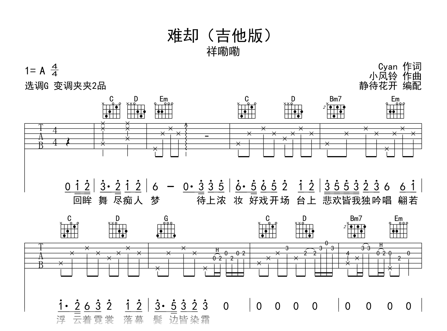 曲谱介绍: 难却吉他谱,祥嘞嘞吉他版,一首国风新曲。《难却》吉他弹唱谱,编配采用G调和弦指法,变调夹夹第2品,原调A调,可据个人音域灵活Capo位置,速度大约每分钟85拍,演奏难度简单。完整版共两张高清图片谱。