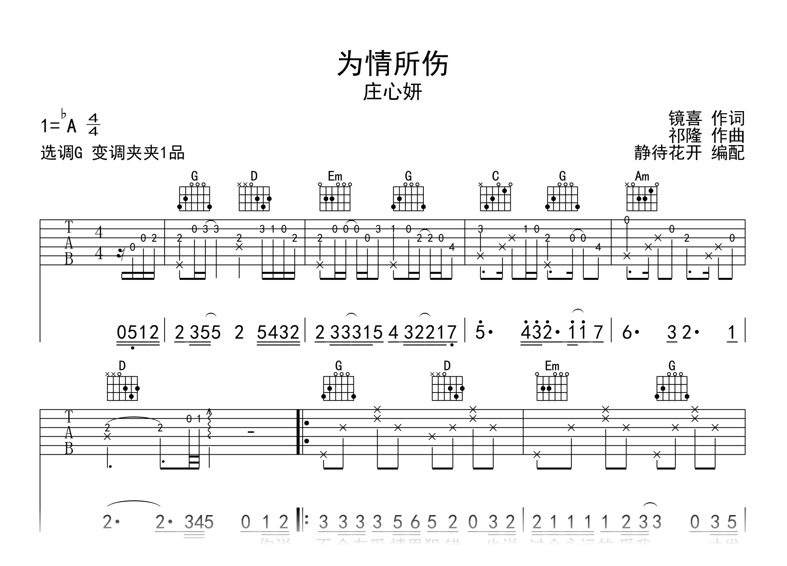 曲谱介绍: 为情所伤吉他谱,庄心妍演唱,歌声细腻而又深邃,娓娓道来一段恋爱絮语。《为情所伤》吉他弹唱谱,编配选用G调和弦指法,变调夹夹第一品,演奏速度大约每分钟85拍,演奏难度简单。