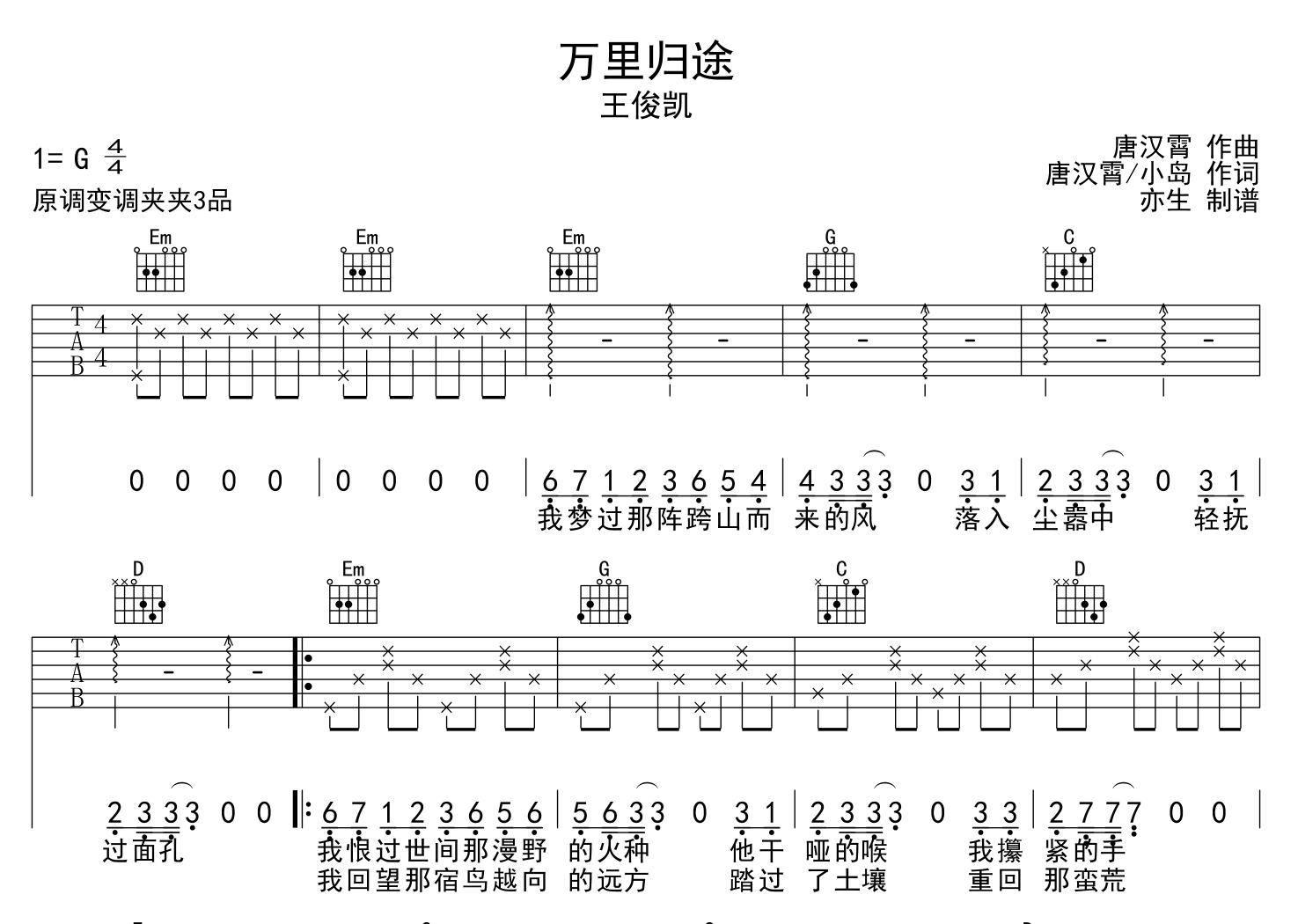 曲谱介绍: 王俊凯《万里归途》吉他谱,同名电影主题曲,《万里归途》吉他弹唱谱,由亦生编配制谱,本吉他谱采用G调和弦指法演奏,推荐变调夹夹第3品,节奏4/4拍,演奏速度大约每分钟95拍,演奏难度简单。