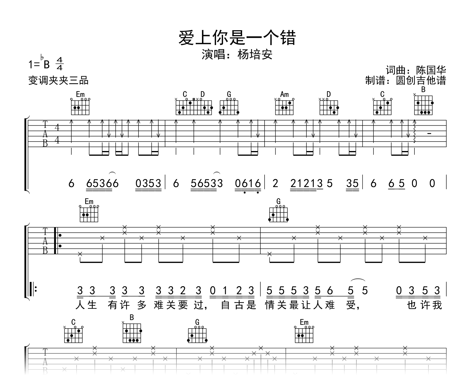 曲谱介绍: 爱上你是一个错吉他谱,杨培安演唱的一首经典抒情歌曲,直抒胸臆,最直接的表达着炽热的情感。老歌重新翻火,更能检验音乐本身的优质。 《爱上你是一个错》吉他弹唱谱,原调降B,变调夹夹三品,选用G调和弦指法编配,随谱附上演奏音频示范,琴友们参照练习。