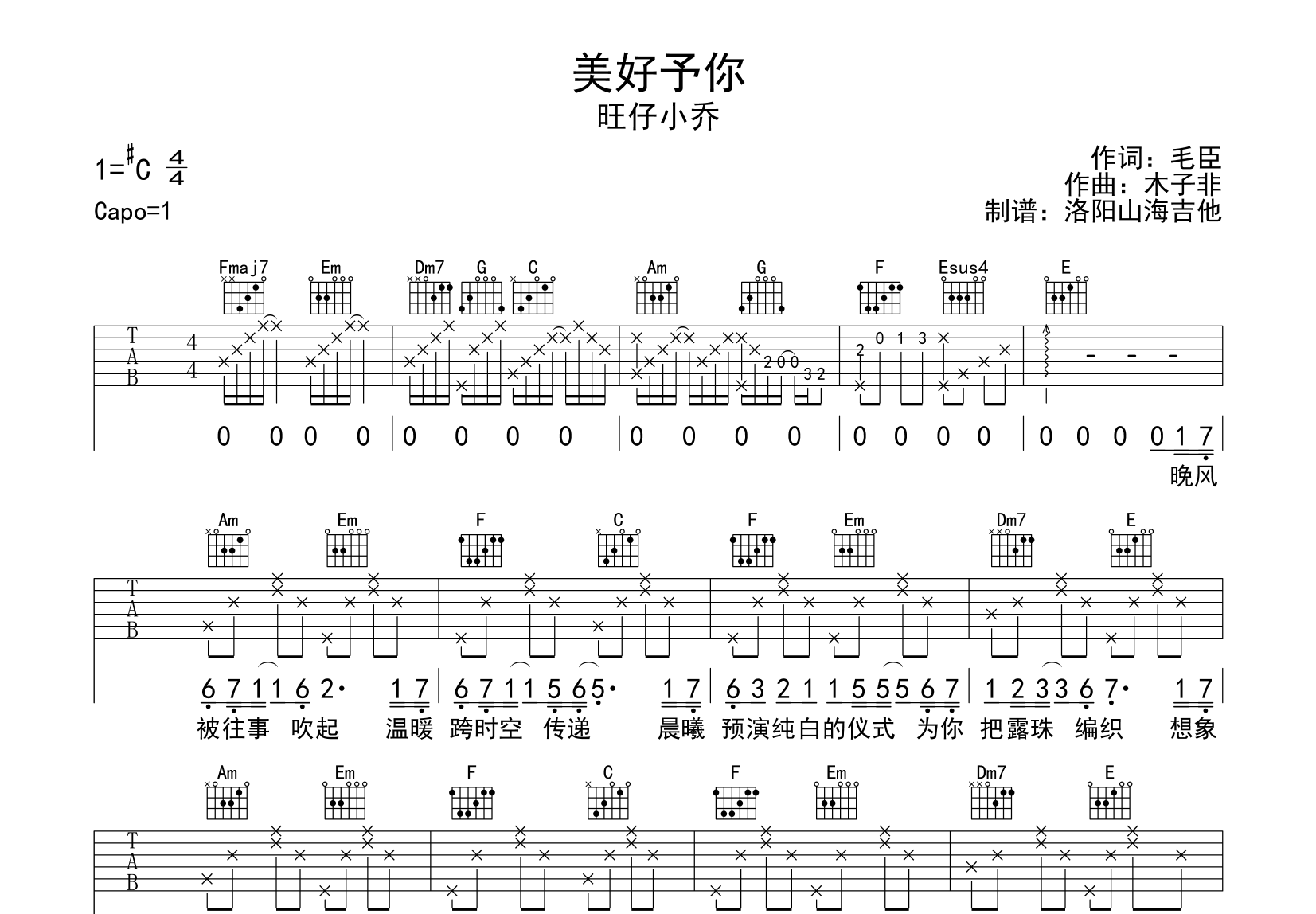 曲谱介绍: 《美好予你》吉他谱,旺仔小乔演唱,《美好予你》吉他弹唱谱,由洛阳山海吉他编配制谱,选用C调指法,原调#C,CAPO夹1品弹唱原调,节奏4/4拍,难度适中,共2张高清图片谱例。