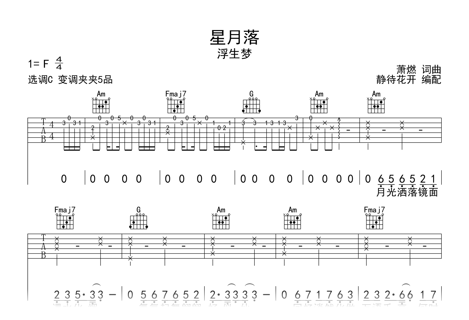 曲谱介绍: 星月落吉他谱,浮生梦演唱的一首古风歌曲,《星月落》吉他弹唱谱,编配采用C调和弦指法,变调夹夹第5品,原调F调,速度大约每分钟80拍,演奏难度简单。