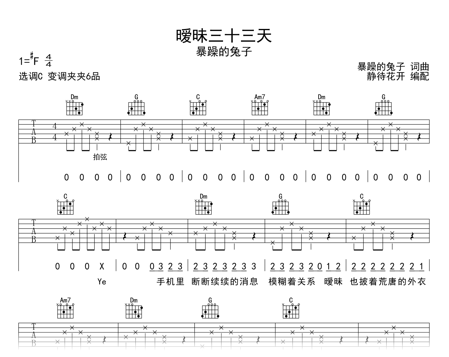 曲谱介绍: 暧昧三十三天吉他谱,暴躁的兔子演唱,歌曲把暧昧时期的那种小心翼翼的拉扯和试探唱了出来。 《暧昧三十三天》吉他弹唱谱,编配采用C调和弦指法,变调夹夹第六品位置,原调#F调,也可根据个人嗓音选择变调夹位置,速度大约每分钟85拍,演奏难度简单。
