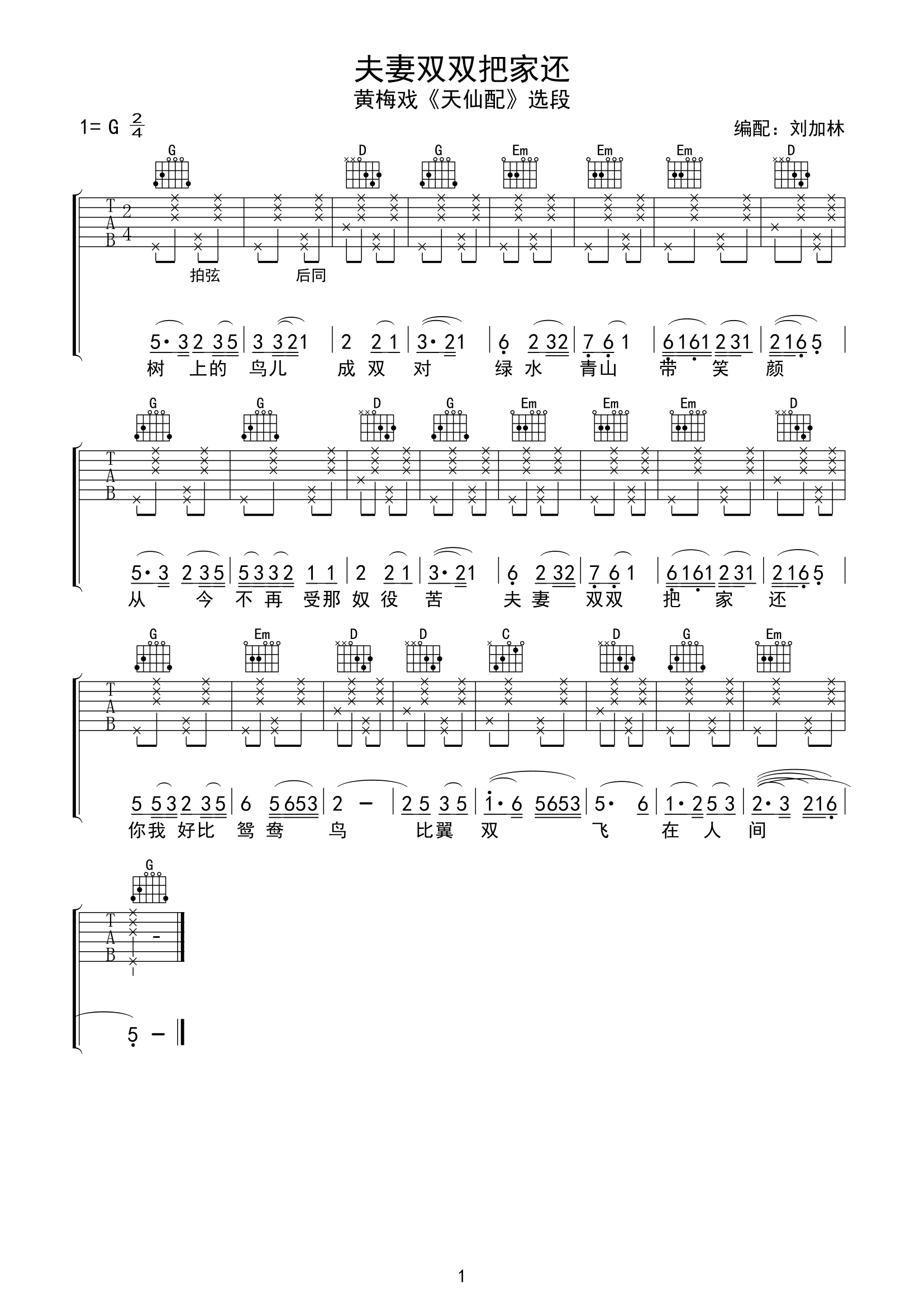 夫妻双双把家还吉他谱 - 天仙配 - G调吉他弹唱谱