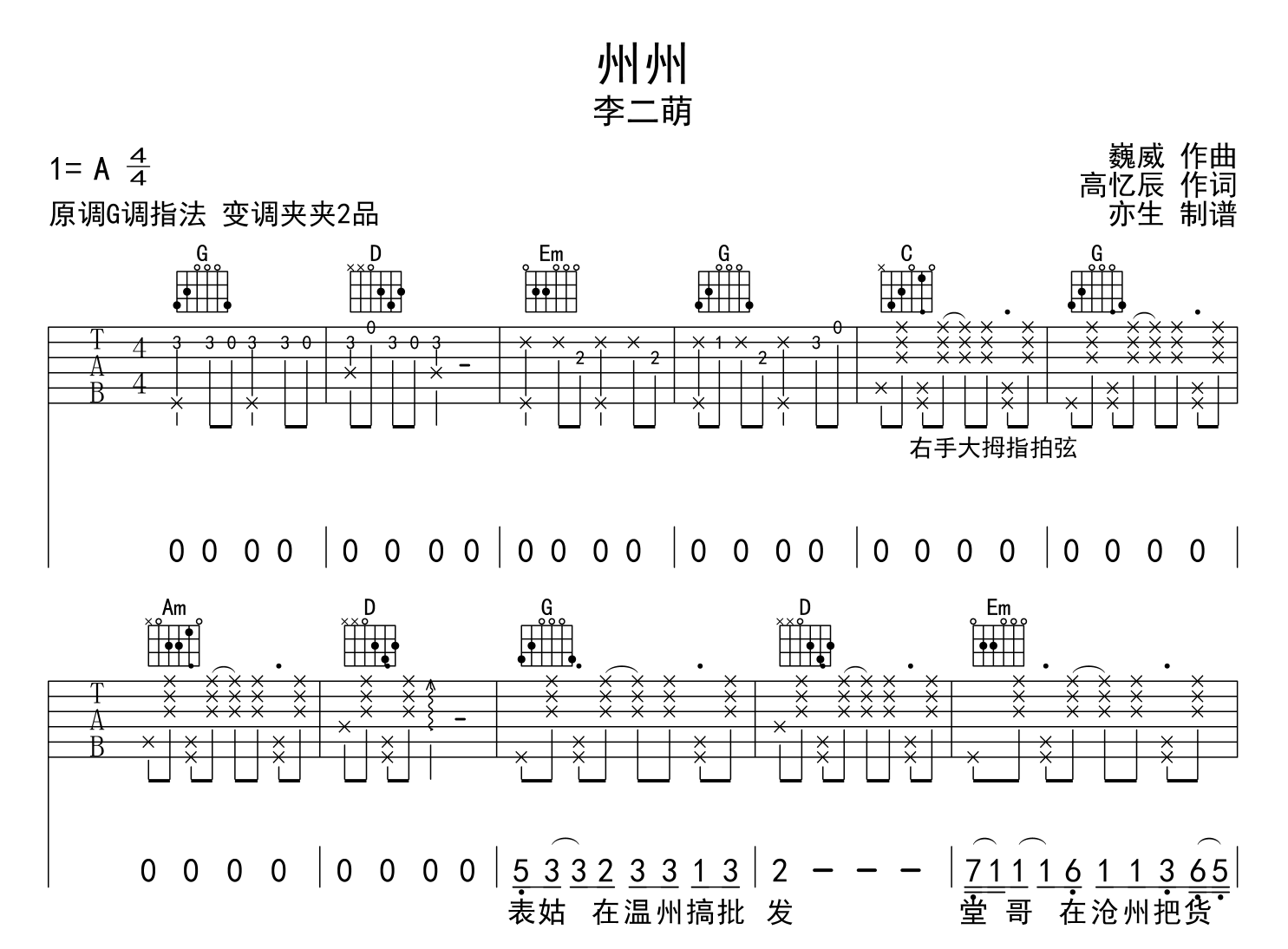 曲谱介绍: 州州吉他谱,李二萌演唱,《州州》吉他弹唱谱,来自@静待花开编配吉他谱,本吉他谱采用G调和弦指法演奏,推荐变调夹夹第2品,节奏4/4拍,演奏速度大约每分钟100拍,演奏难度简单。