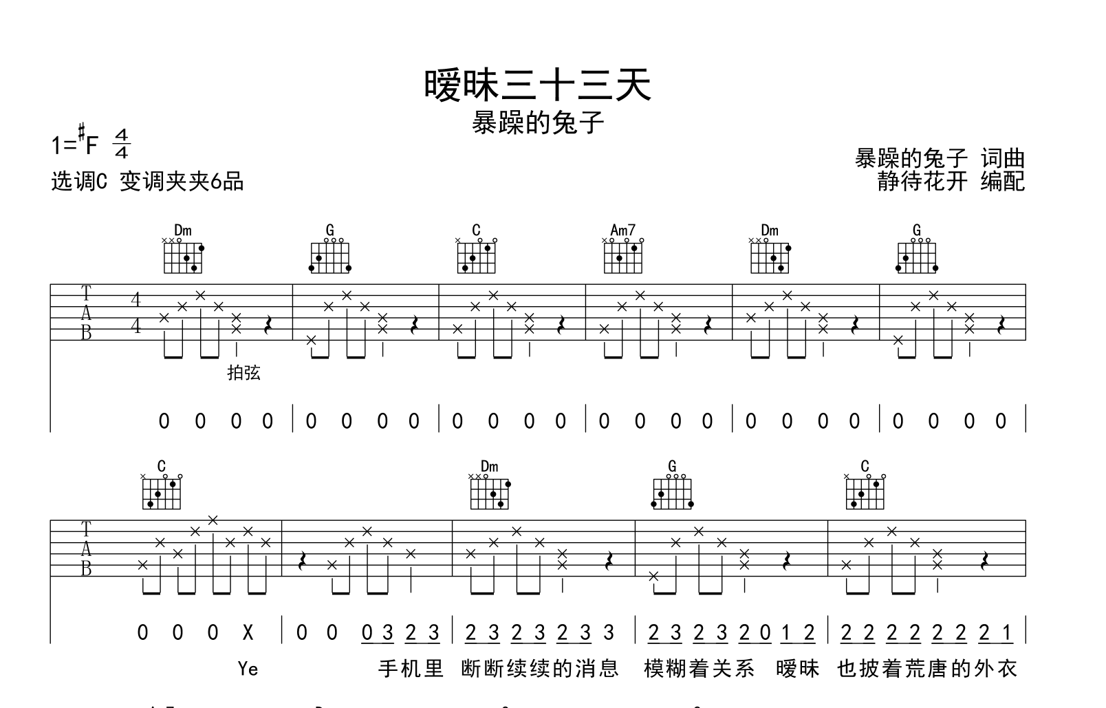 曲谱介绍: 《暧昧三十三天》吉他谱,暴躁的兔子演唱,《暧昧三十三天》吉他弹唱谱,来自@静待花开编配吉他谱,共3张高清图片谱,采用C调和弦指法演奏,推荐变调夹夹第6品,原调#F调,也可以根据个人嗓音灵活选择变调夹位置,演奏速度大约每分钟85拍,演奏难度简单。