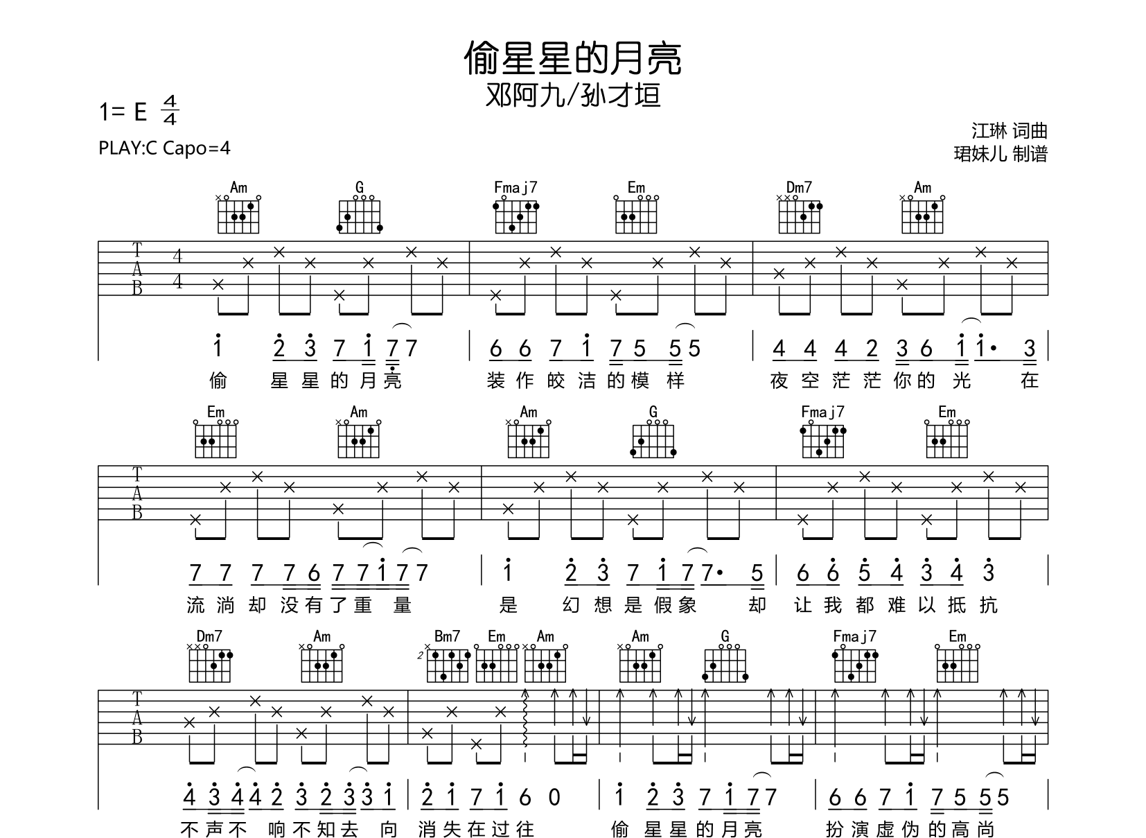 曲谱介绍: 《偷星星的月亮》吉他谱,邓阿九/孙才垣演唱,《偷星星的月亮》吉他弹唱谱,本吉他谱采用C调指法编配,弹唱建议变调夹4品,速度85BPM,难度较简单,易上手。共3张高清图片谱例。