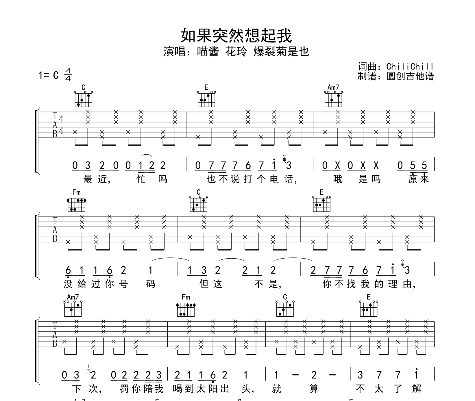 如果突然想起我吉他谱 - 喵酱 - C调吉他弹唱谱