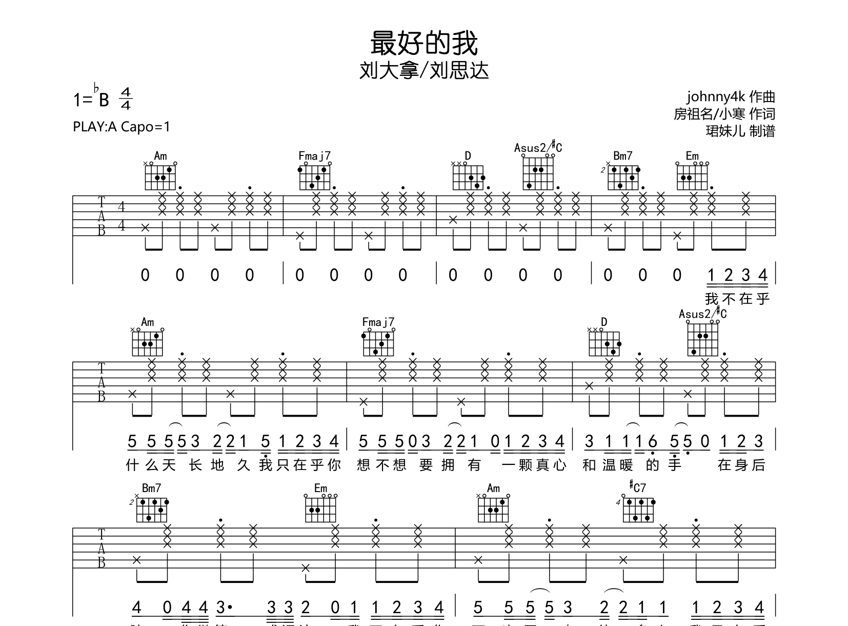 曲谱介绍: 最好的我吉他谱,刘大拿/刘思达演唱,最好的我吉他弹唱谱,由珺妹儿编配制谱,本吉他谱采用A调指法编配,弹唱建议变调夹1品,速度85BPM难度较简单,易上手。共有5张高清图片谱例。