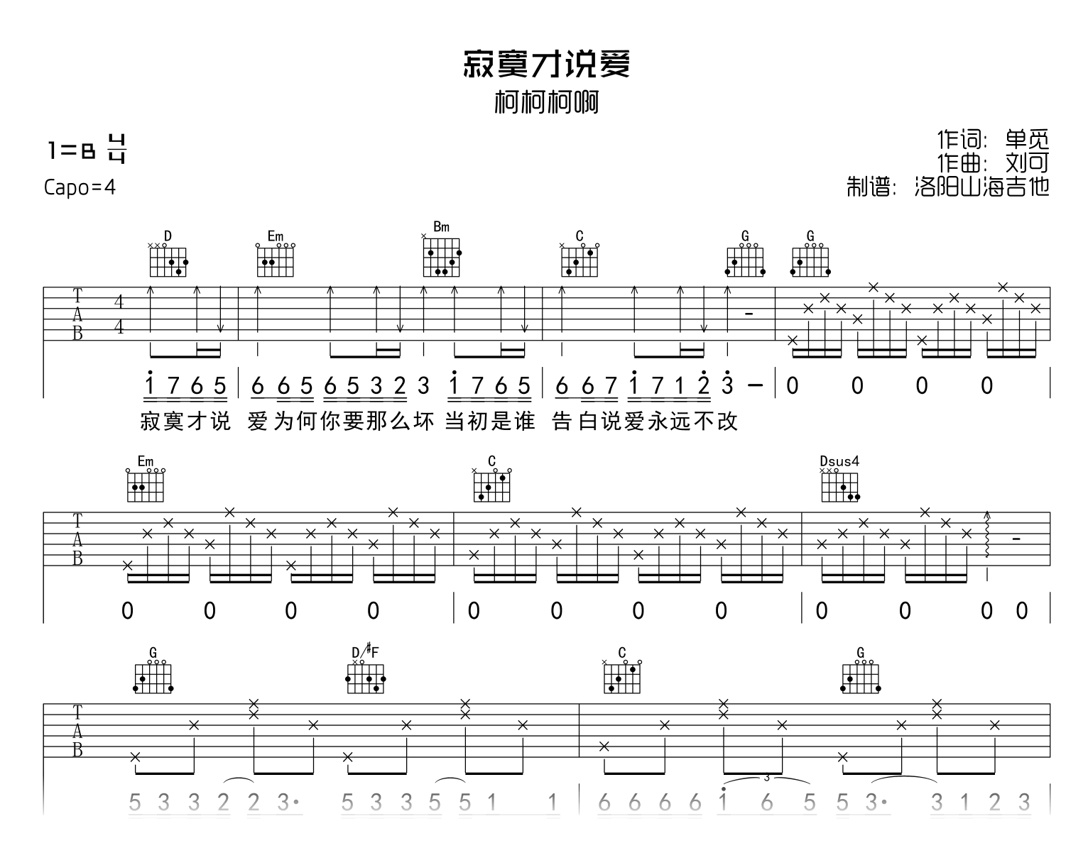 曲谱介绍: 寂寞才说爱吉他谱,柯柯柯啊翻唱版本,《寂寞才说爱》吉他弹唱谱,原调B,选用G调和弦指法,Capo夹第四品。完整编配版本共两张高清图片谱。