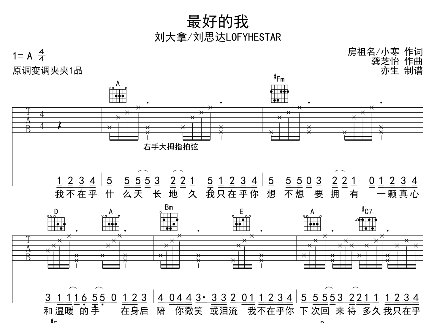 曲谱介绍: 《最好的我》吉他谱,刘大拿和刘思达演唱的歌曲,《最好的我》吉他弹唱谱,由亦生编配制谱,此吉他谱采用A调和弦指法演奏,推荐变调夹夹第1品,节奏4/4拍,演奏速度大约每分钟95拍,演奏难度中等。共有5张高清六线谱图例。