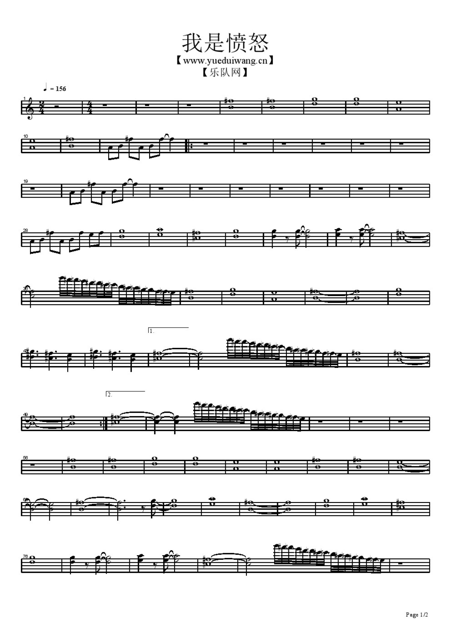 我是愤怒钢琴谱 - BEYOND - 键盘谱