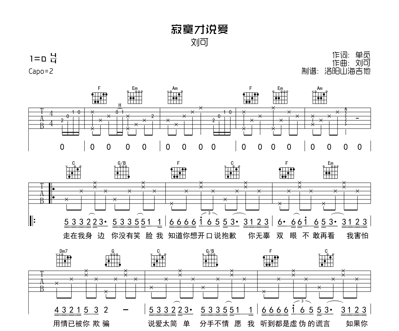 曲谱介绍: 《寂寞才说爱》吉他谱,刘可演唱,《寂寞才说爱》吉他弹唱谱,由洛阳山海吉他编配制谱,选用C调指法,原调D调,节奏4/4拍,难度简单,共有2张高清图片谱例。