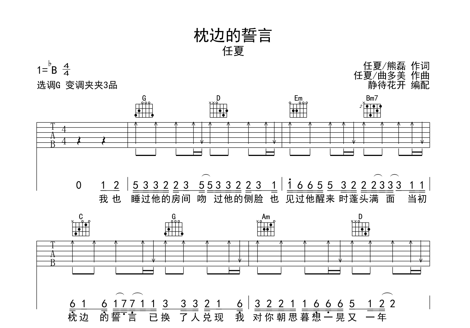 曲谱介绍: 《枕边的誓言》吉他谱,任夏演唱,《枕边的誓言》吉他弹唱谱,来自@静待花开编配吉他谱,采用G调和弦指法演奏,推荐变调夹夹第3品,原调bB调,也可以根据个人嗓音灵活选择变调夹位置,演奏速度大约每分钟80拍,演奏难度简单。共有3张高清图片谱。