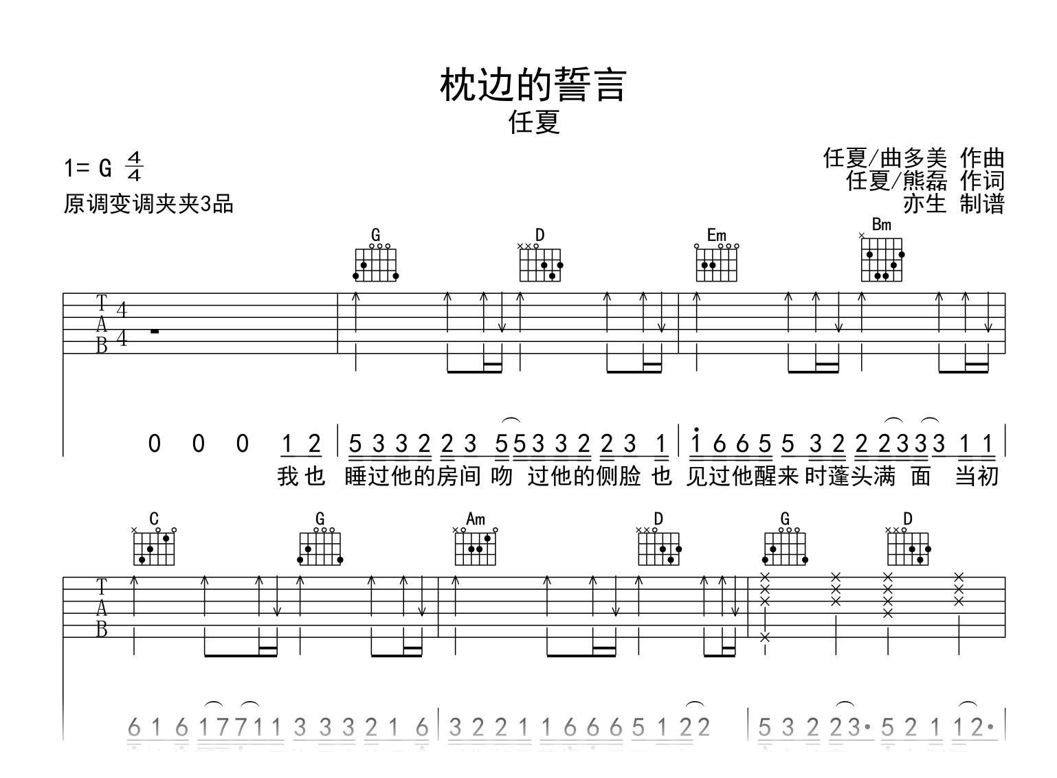 曲谱介绍: 枕边的誓言吉他谱,任夏演唱,一首网络伤感歌曲。《枕边的誓言》吉他弹唱谱,采用G调和弦指法编配,推荐变调夹夹第3品,原调降B调,节奏4/4拍,速度大约每分钟95拍,演奏难度简单。