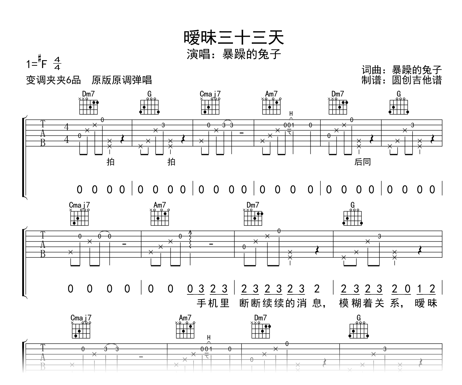 曲谱介绍: 暧昧三十三天吉他谱,暴躁的兔子演唱,低沉略带伤感的嗓音,结合诉说式的曲调表达出对感情的态度 。《曖昧三十三天》吉他弹唱谱,歌曲原调F#调,选C调指法编配,变调夹夹第六品就是歌曲原调。完整版共四张高清图片谱例。 演奏指法简单、和弦简单,适合新手,随谱附上音频示范,琴友们参照练习,推荐收藏。