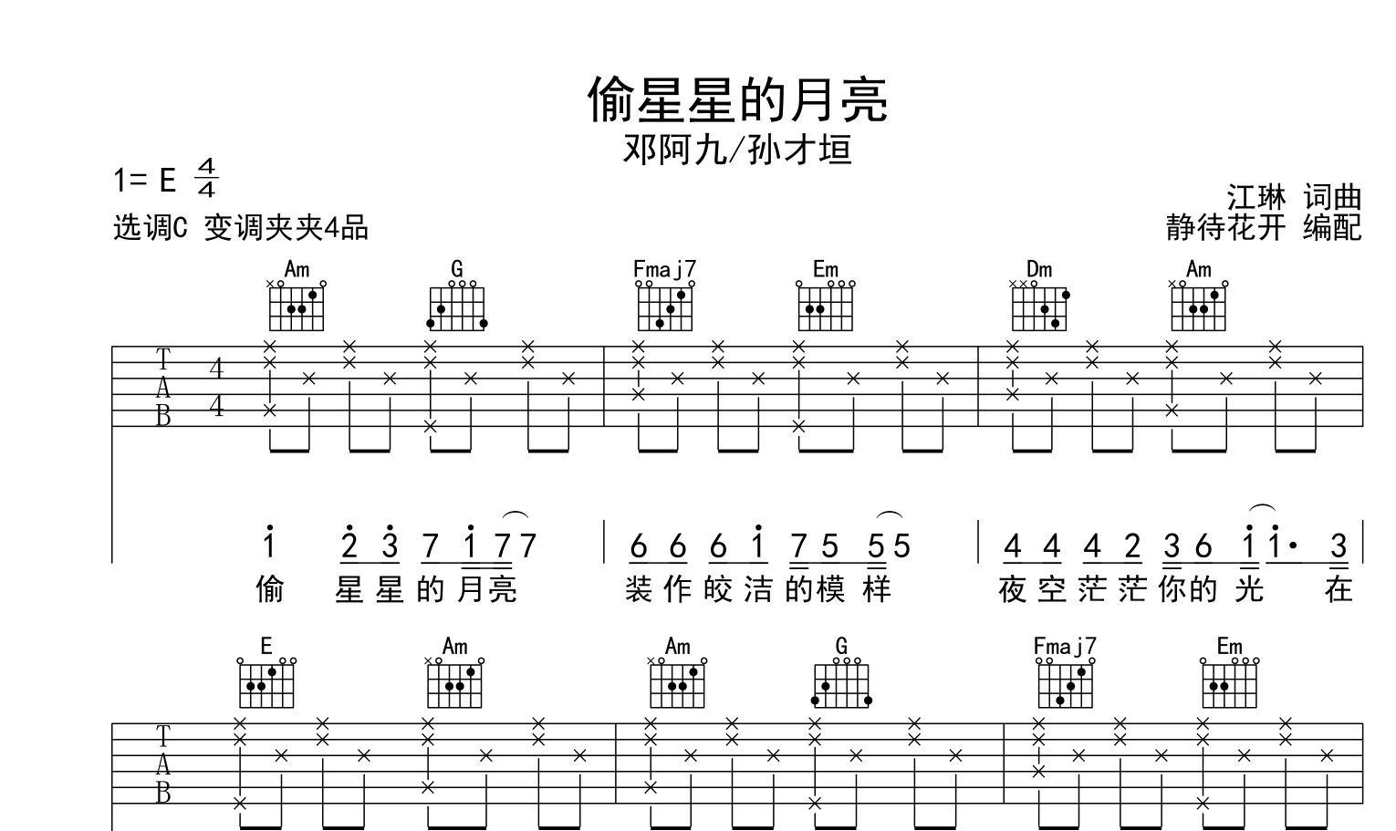 曲谱介绍: 邓阿九/孙才《偷星星的月亮》吉他谱,邓阿九/孙才垣演唱,《偷星星的月亮》吉他弹唱谱,来自@静待花开编配吉他谱,采用C调和弦指法演奏,推荐变调夹夹第4品,原调E调,也可以根据个人嗓音灵活选择变调夹位置,演奏速度大约每分钟85拍,演奏难度简单。