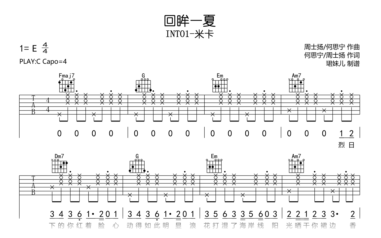曲谱介绍: 回眸一夏吉他谱,INTO1-米卡演唱,《回眸一夏》吉他弹唱谱,原调E,采用C调指法编配,建议变调夹4品,速度95BPM,演奏难度较简单易上手。