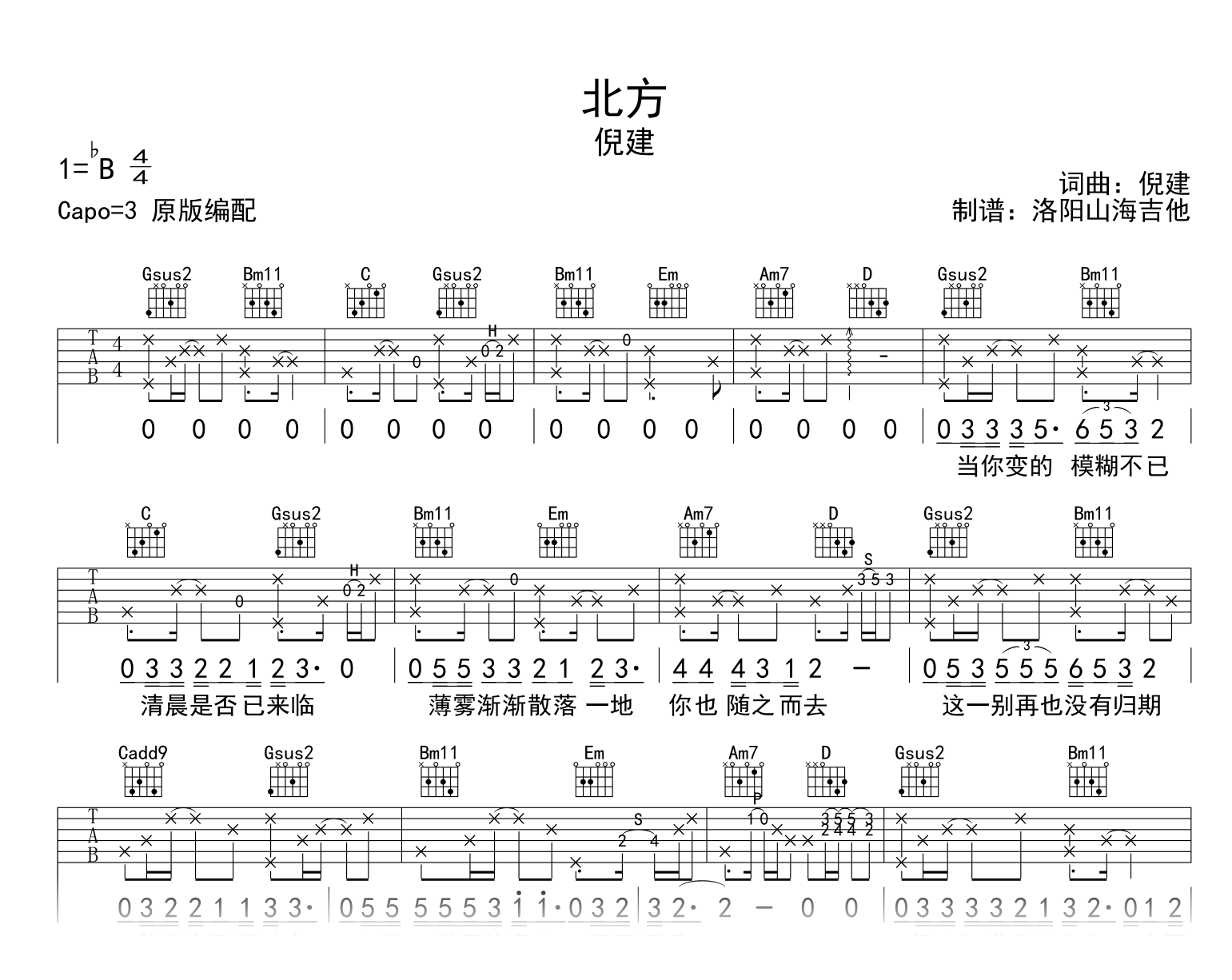 曲谱介绍: 北方吉他谱,倪健的一首经典代表民谣歌曲,他的声音,孤寂温情。他的歌词, 诗意常在。不念过往,,不忆北方。 《北方》吉他弹唱谱,原调降B,选用G调指法原版编配,变调夹夹Capo三品,高清六线谱共两张图片。