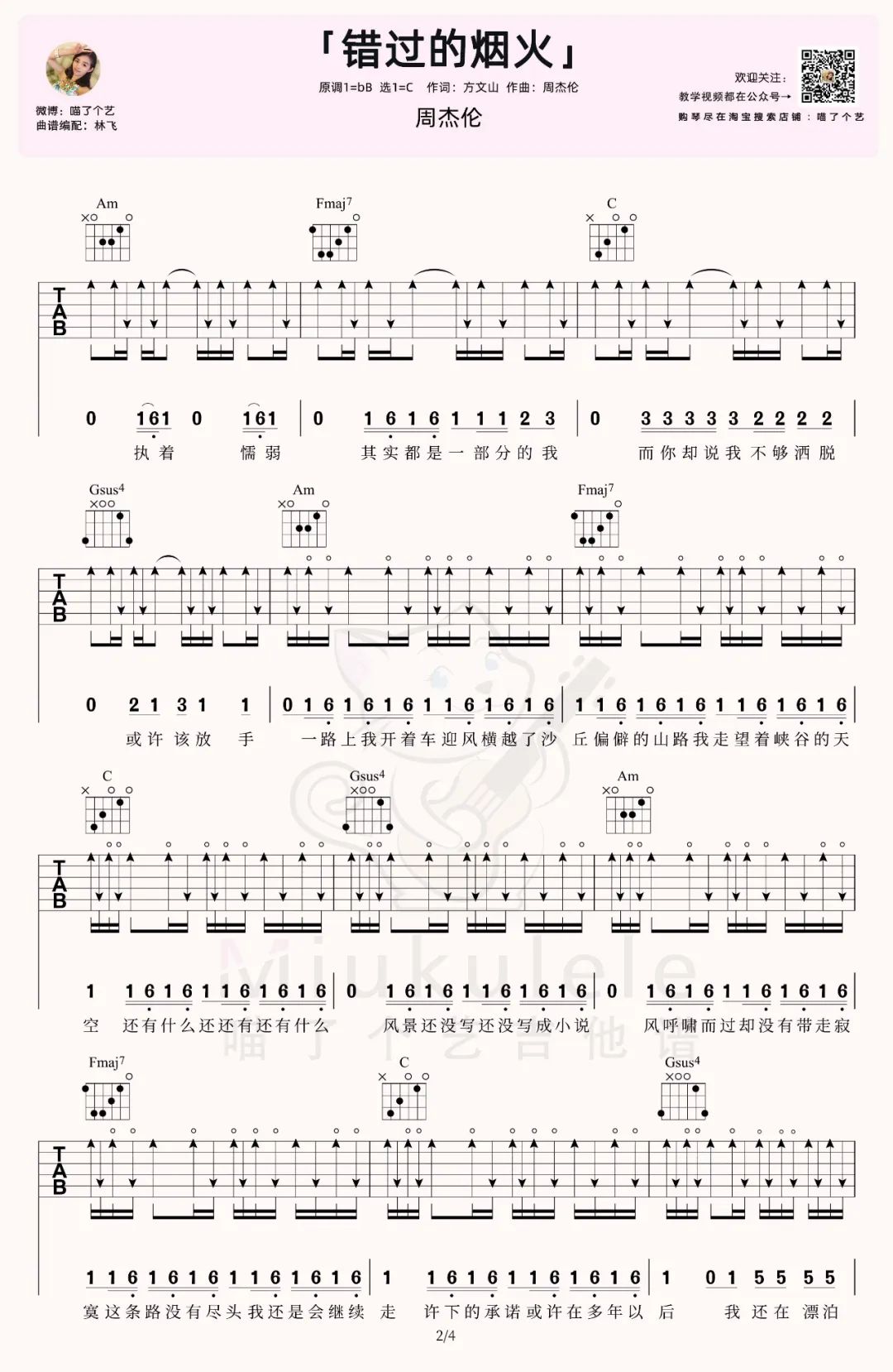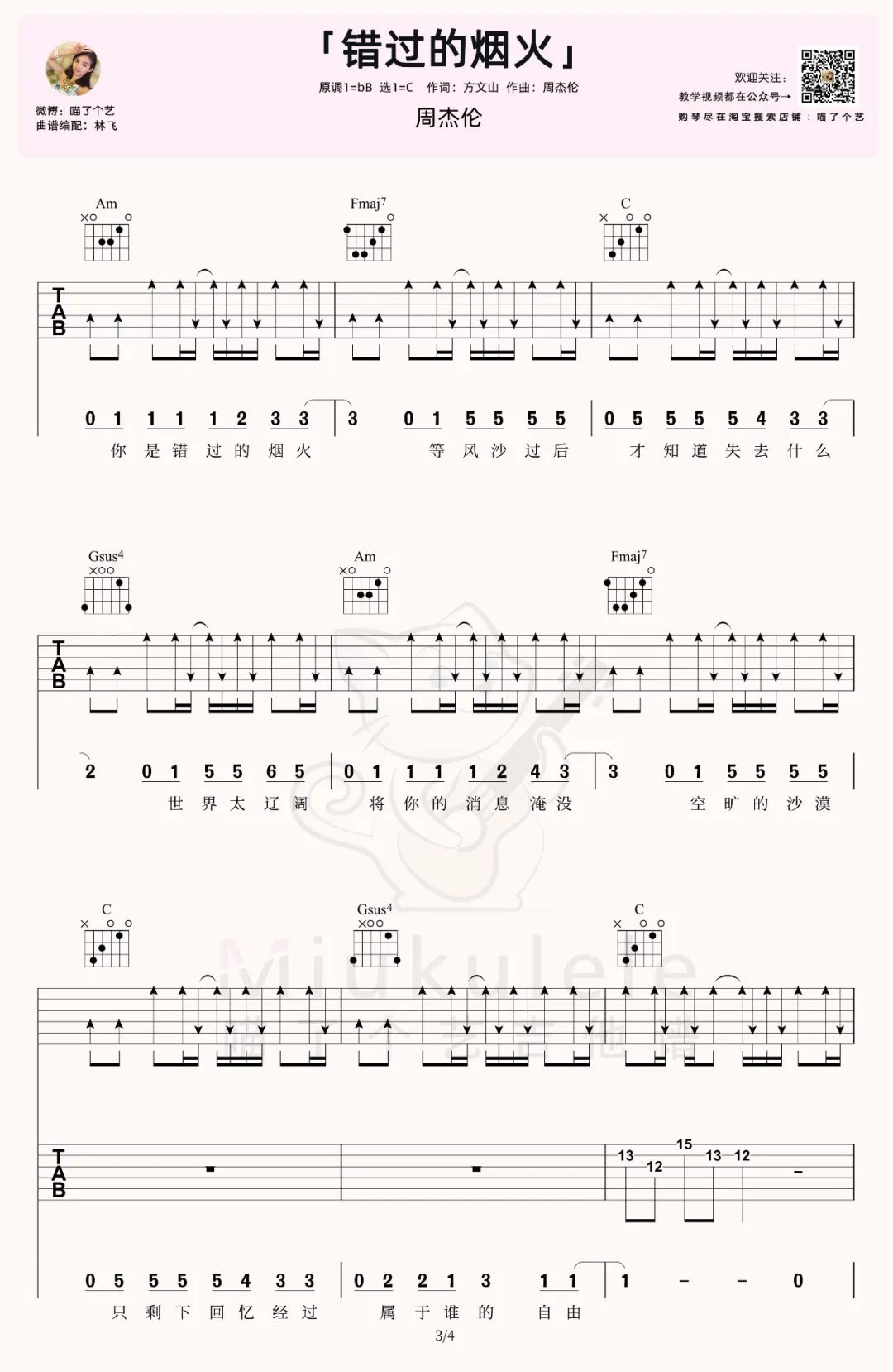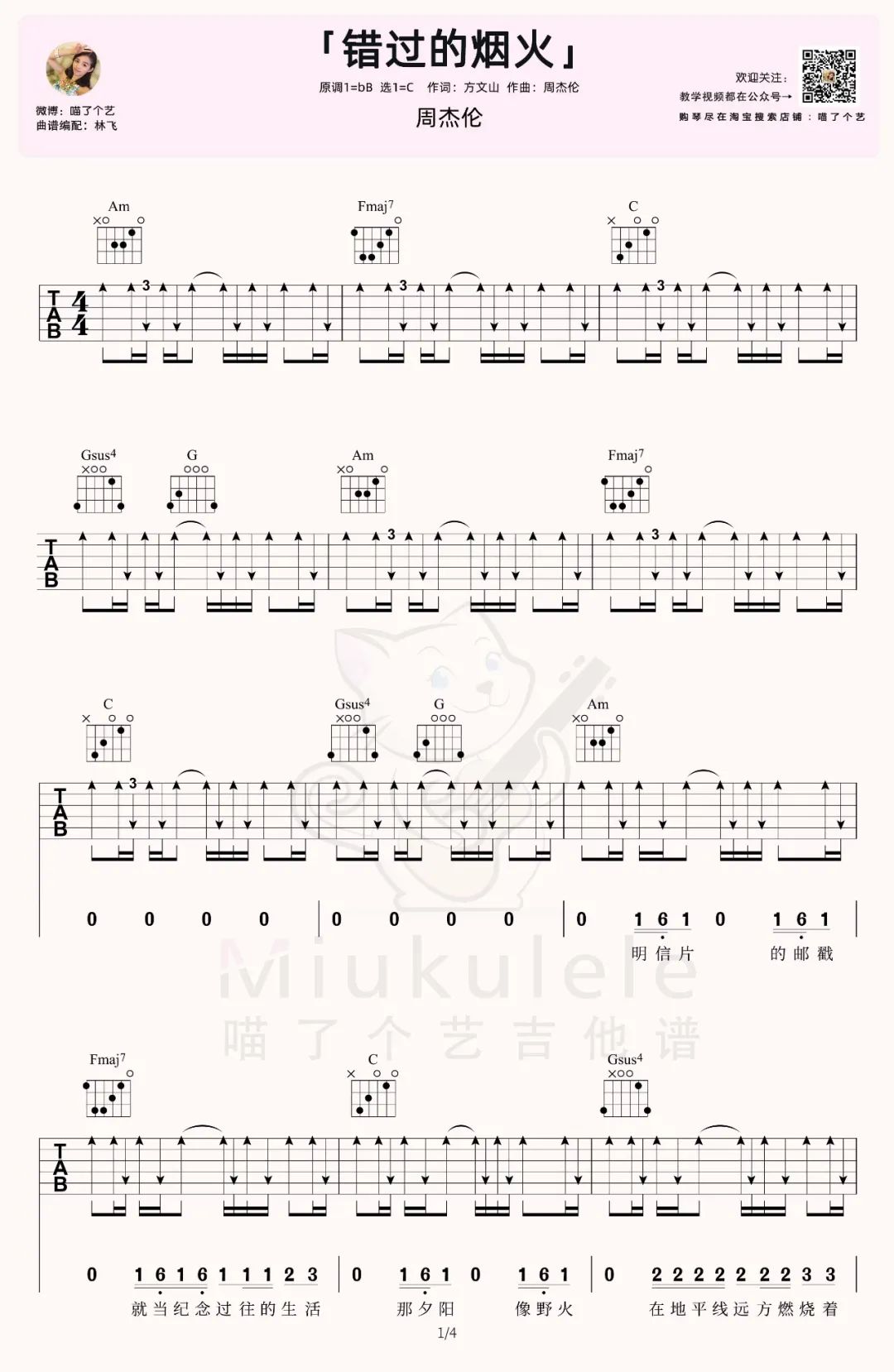 曲谱介绍: 吉他谱介绍:错过的烟火吉他谱,周杰伦演唱的一首歌曲,4/4拍的节奏,这首歌曲的原调为降B调,这里曲谱采用了C调指法进行编配,演唱时降全音调弦可回到原调,也可根据个人实际嗓音情况选择不降音或夹几品。曲谱由琴谱网更新上传,共4张高清图片弹唱吉他谱例,来源于@喵了个艺编配出品。杰伦新歌里闭眼能感受到最辽阔场景的,我选这首。席卷而过的海风,匆匆陨落的夕阳,扫弦与滞音交错,是我们表达错过的方式。 错过的烟火吉他弹唱教学
