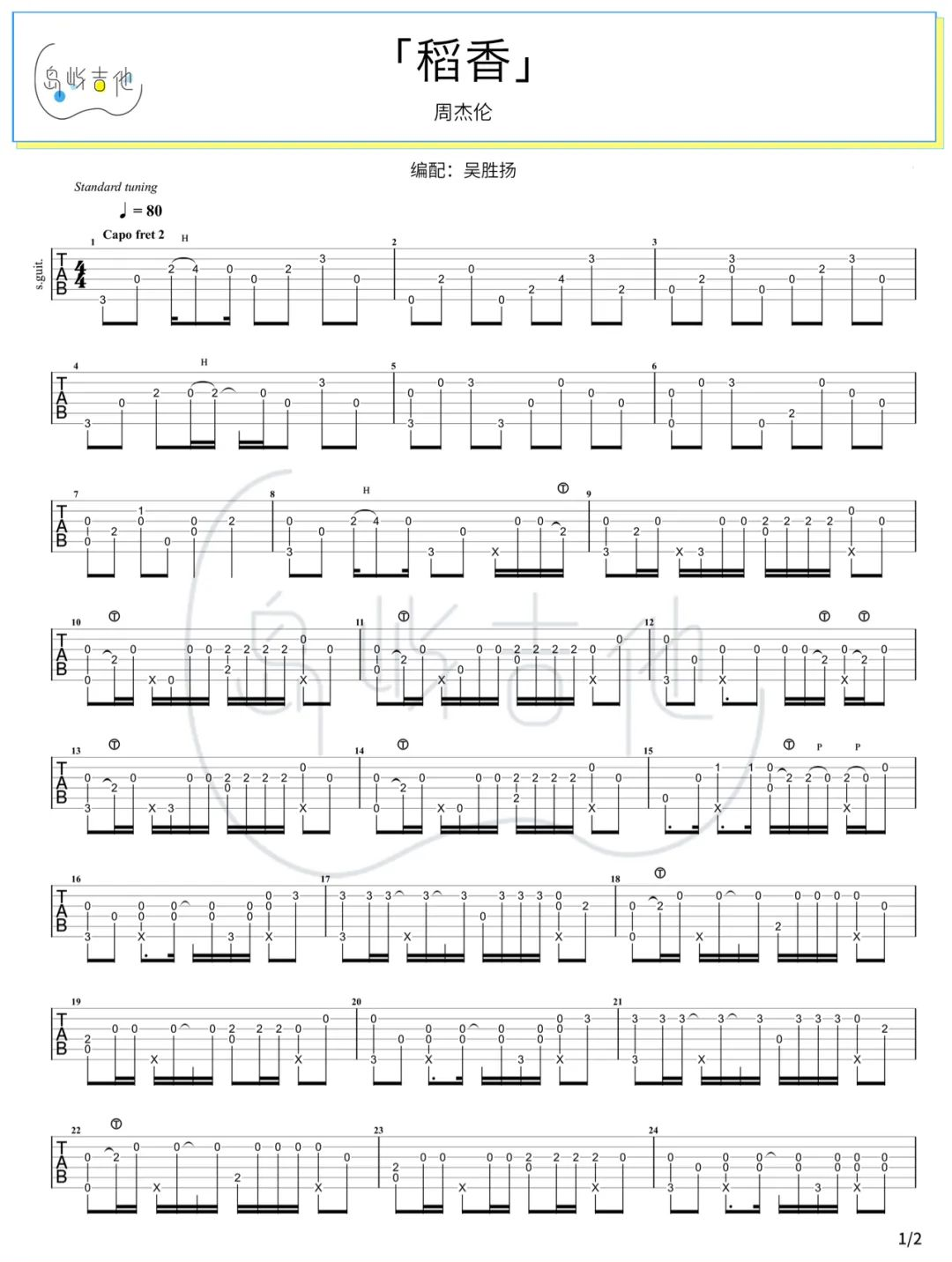 曲谱介绍: 《稻香》指弹教学视频 本歌曲吉他谱链接:       稻香指弹谱,根据周杰伦的经典歌曲《稻香》所改编的吉他指弹独奏曲谱,选用的G调指法,弹回A调,所以变调夹可夹2品,速度控制在80拍每分钟,节奏4/4拍,指弹难度:3级较简单。 让我们随着熟知的音乐去感受稻穗的味道,抛掉现在内心痛苦挣扎的烦恼,放空回到当初去寻找那些美好。 指弹谱详情