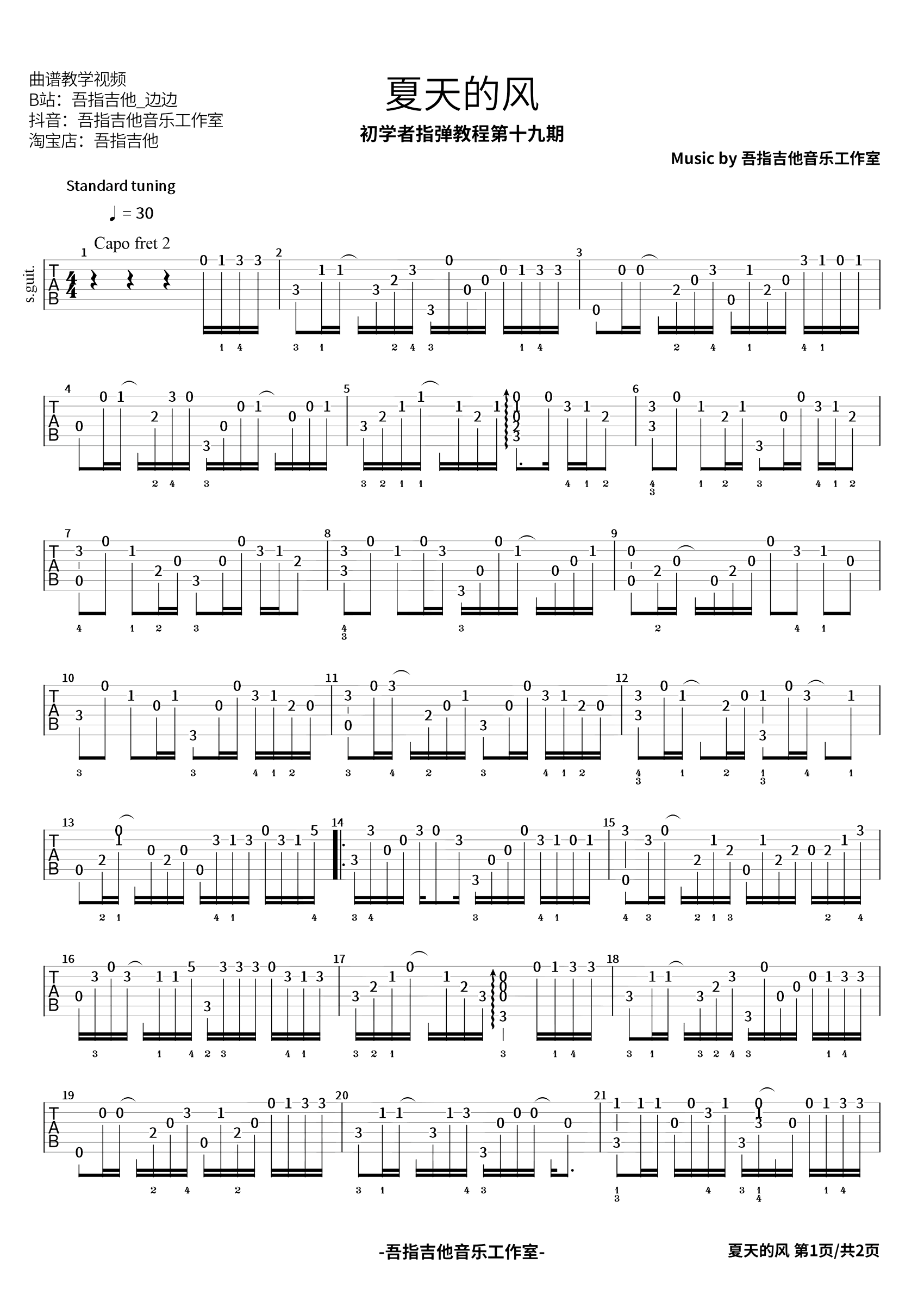曲谱介绍: 夏天的风指弹吉他谱,根据温岚的歌曲所改编,由吾指吉他工作室制谱和提供教学,弹奏之时需了解本谱的速度是30拍每分钟,选用的C调指法,CAPO需要夹2品按D调去进行弹奏推进,建议大家弹奏前先结合视频进行参考。