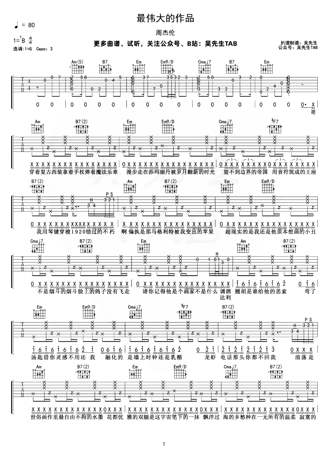 曲谱介绍: 本歌曲推荐吉他谱链接:         《最伟大的作品》吉他谱,周杰伦演唱的新歌,时空的旅人,邂逅跨世纪艺术家们的浪漫。 《最伟大的作品》吉他弹唱谱,选用G调指法,原调是bB调,节奏是4/4拍,速度控制在80拍每分钟,本谱的编配较细,算是接近原版的一个特别版本,难度:5级适中。