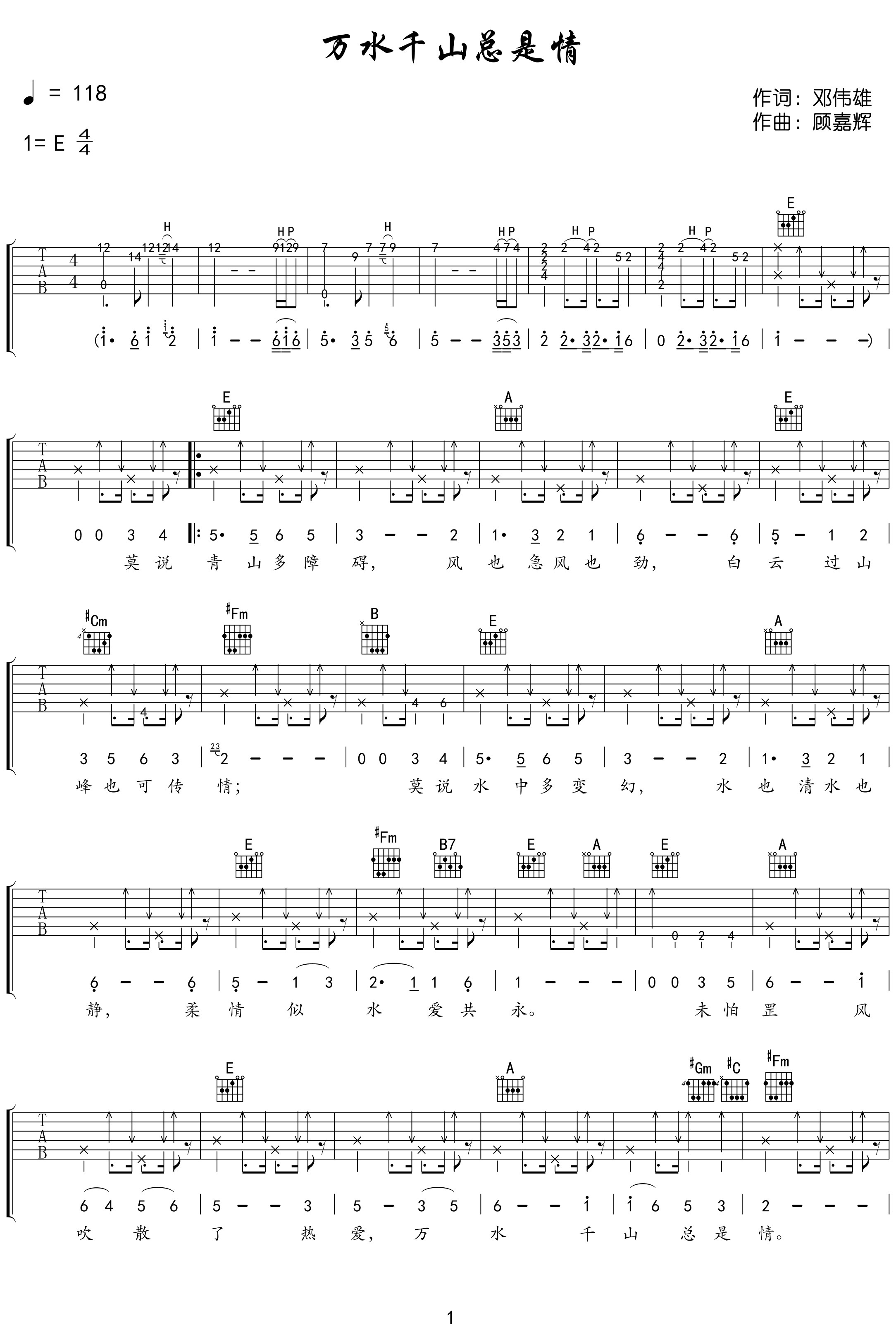 曲谱介绍:   本歌曲吉他谱推荐链接:     万水千山总是情吉他谱,是汪明荃演唱的粤语歌曲,也是香港同名电视剧主题曲,轻柔且温情的悄悄捕获了我们深刻的记忆,纵然千山万水,聚散分离,都无法磨灭掉彼此的深情。 万水千山总是情吉他弹唱谱,选用E调指法,原调编配,速度118拍每分钟,节奏4/4拍,本谱含完整前奏按原版编配,难度:6级,谱中的许多技巧对于新手来说较难,推荐中级以上练习,弹唱效果可试听音频。