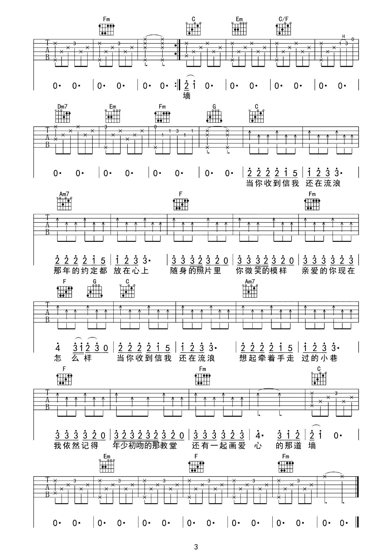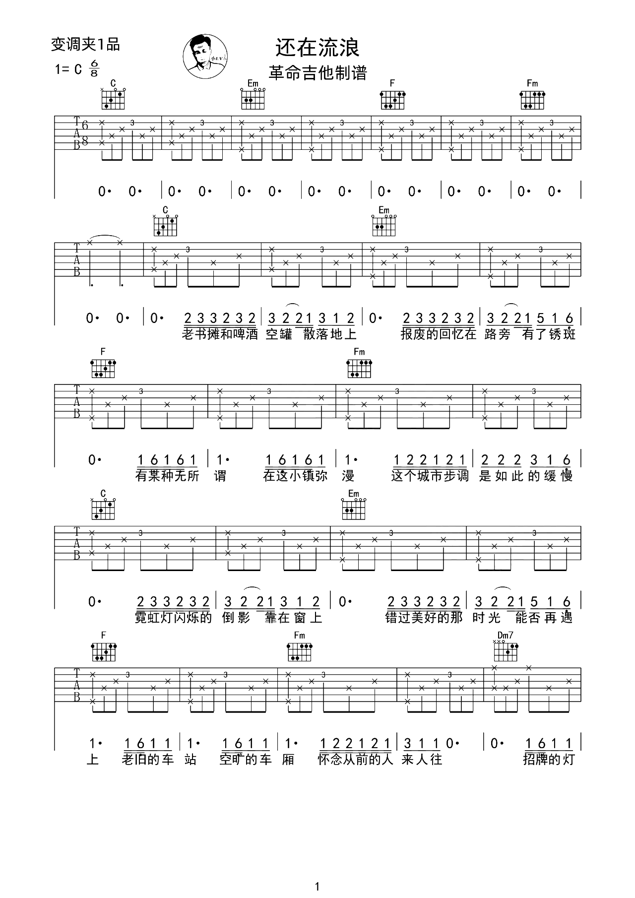 曲谱介绍: 还在流浪吉他谱,周杰伦演唱的新专辑歌曲,方文山用“流浪”为主题,刻写出了感情距离的悲伤,我们也首次看到MV中没有J女郎的出现,“当你收到信,我还在流浪,那年的约定都放在心上”,唱出了因为漂泊闯荡而无法在一起恋情的共鸣心伤。 《还在流浪》吉他弹唱谱,选用C调指法,原调#C,节奏6/8拍,CAPO夹1品弹回原调,还原度还是比较高,难度:3级较简单。