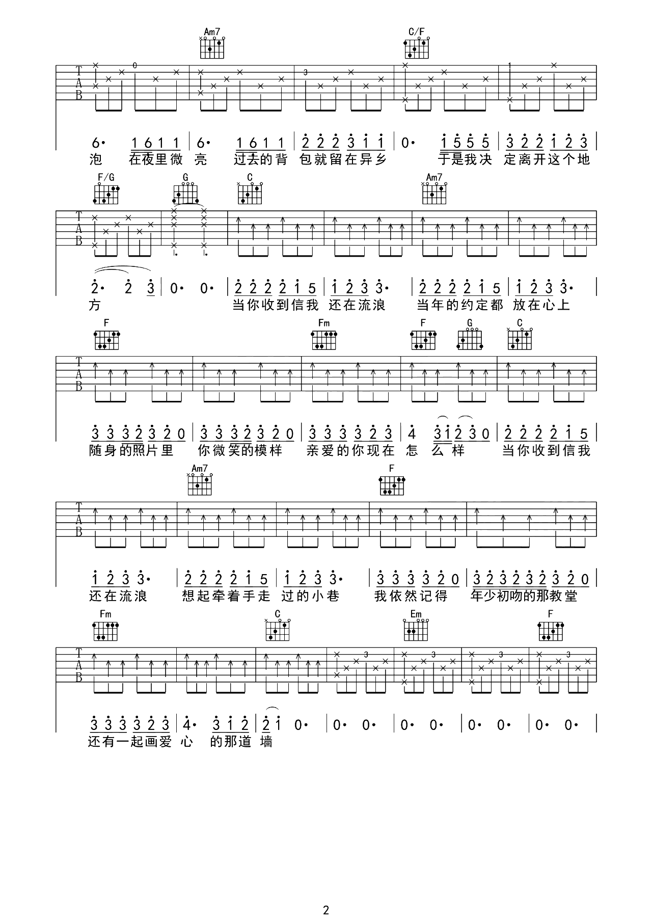 曲谱介绍: 还在流浪吉他谱,周杰伦演唱的新专辑歌曲,方文山用“流浪”为主题,刻写出了感情距离的悲伤,我们也首次看到MV中没有J女郎的出现,“当你收到信,我还在流浪,那年的约定都放在心上”,唱出了因为漂泊闯荡而无法在一起恋情的共鸣心伤。 《还在流浪》吉他弹唱谱,选用C调指法,原调#C,节奏6/8拍,CAPO夹1品弹回原调,还原度还是比较高,难度:3级较简单。