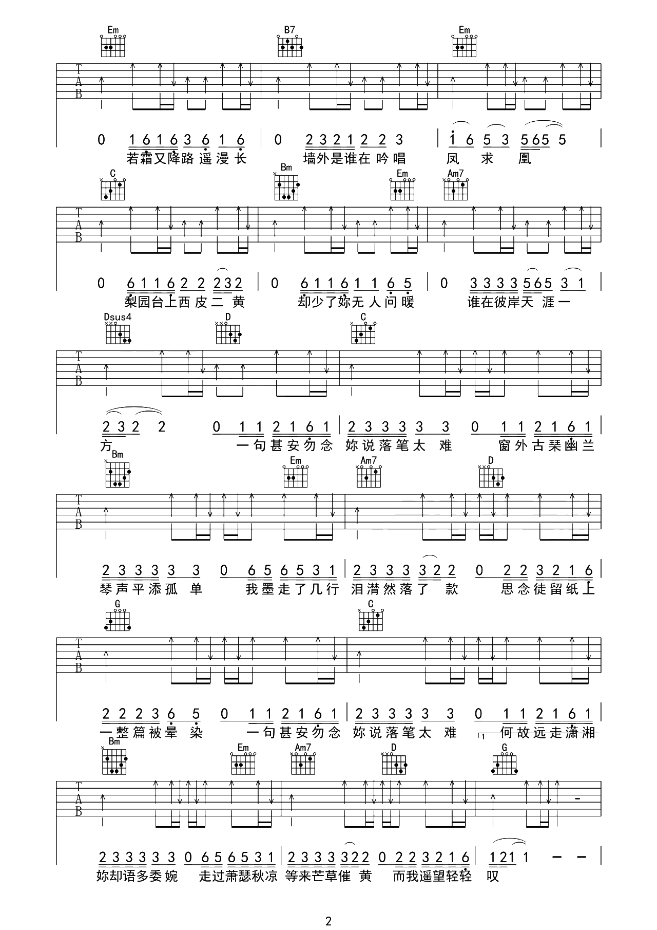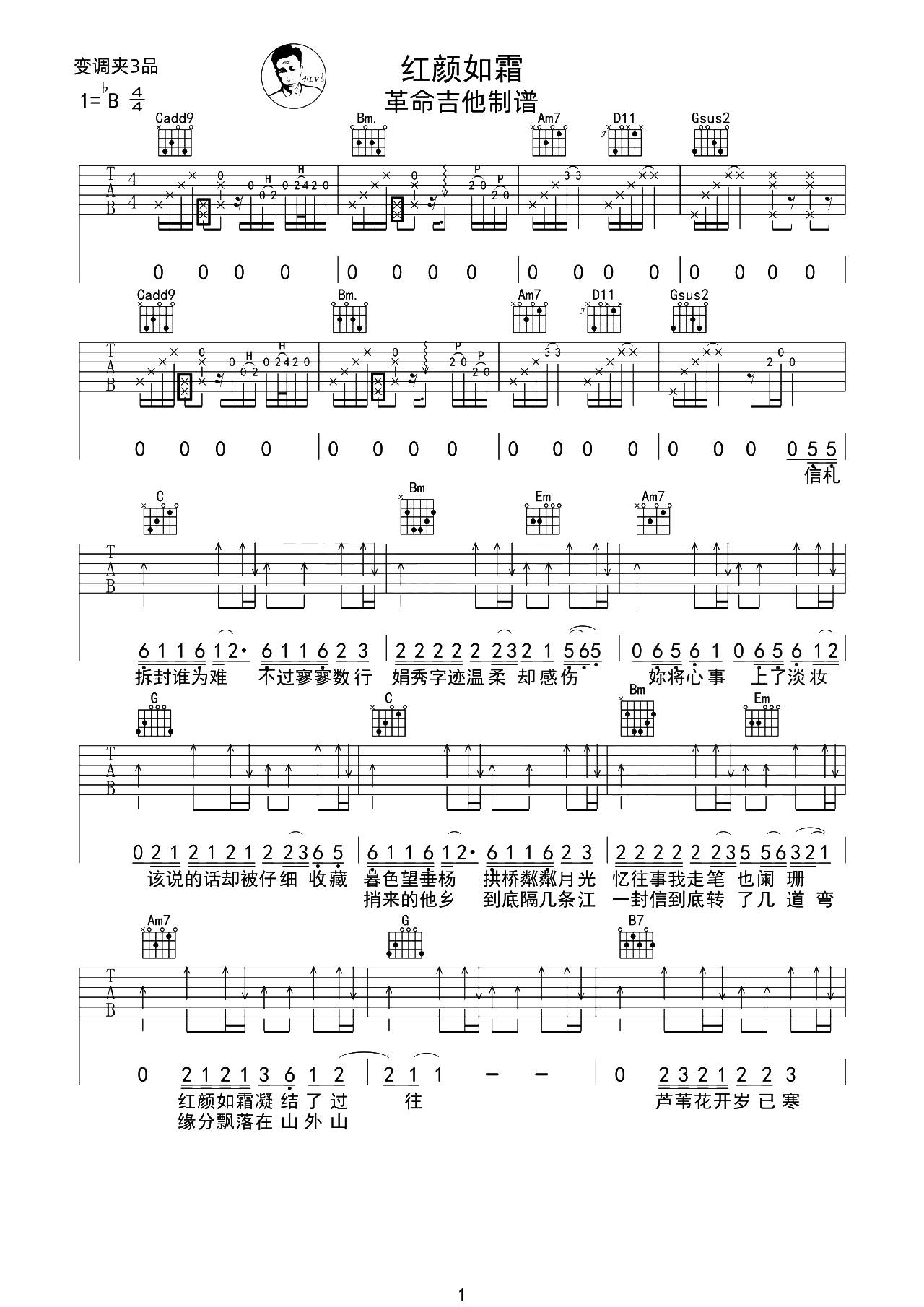 曲谱介绍: 《红颜如霜》再次掀起周氏中国风高潮,方文山强大的国学文化底蕴驾驭唯美动人歌词轻车熟路,周杰伦用一句京腔“凤求凰”迎来无数老粉“爷青回”。 《红颜如霜》吉他谱,周杰伦演唱的国风新曲,《红颜如霜》吉他弹唱谱,选用G调指法,原调bB,需要夹3品可弹唱原调,节奏4/4拍,难度5级适中。 本歌曲的其他曲谱版本推荐: