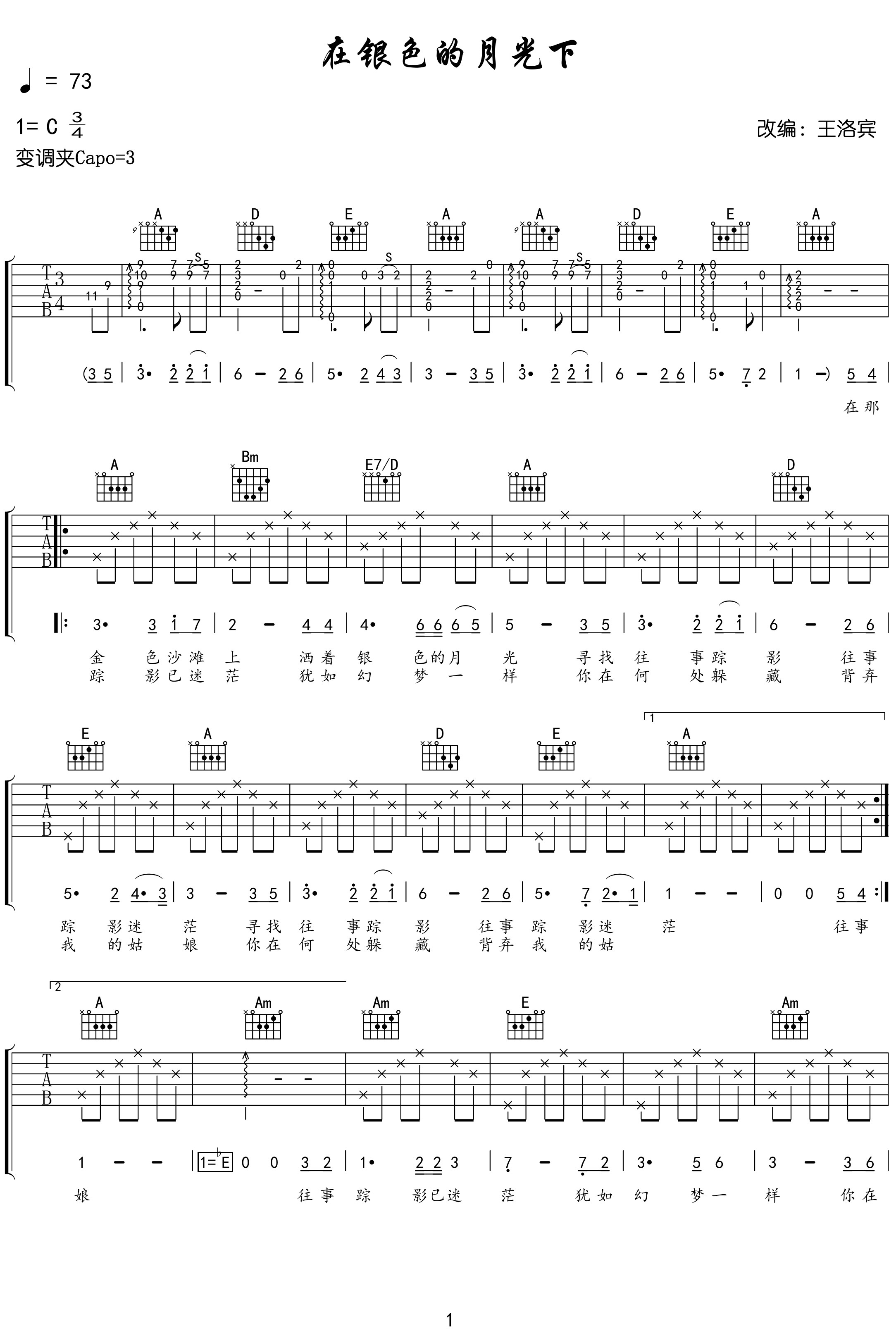 曲谱介绍:   在银色的月光下吉他谱,王洛宾改编演唱的俄罗斯民歌 《在银色的月光下》吉他弹唱谱,选用C调指法,原调bE,CAPO夹3品弹唱原调,速度73拍每分钟,节奏3/4拍,难度:5级适中,随谱附有本谱的示范音频。