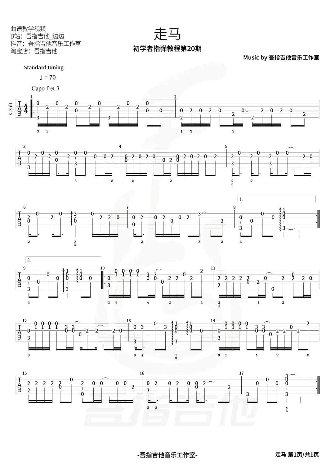 曲谱介绍: 本歌曲的其他吉他谱版本链接:     走马指弹吉他谱,根据陈粒的一首经典民谣所改编的吉他独奏曲目,速度控制在70拍每分钟,CAPO夹3品弹奏,指弹难度:3级较简单。 民谣总是以简单的旋律从来无需太复杂的渲染,而《走马》正是这样一首歌,以别样的方式诠释着爱情的行进,走走停停,也许才是沿途值得回味的风景。