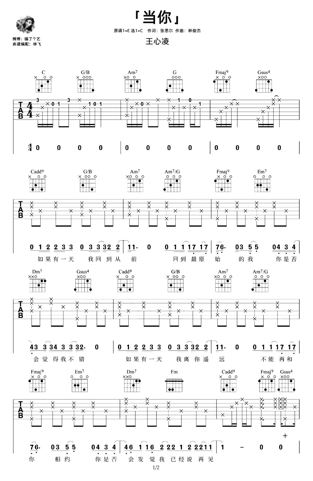 曲谱介绍: 《当你》的其他曲谱版本推荐     当你吉他谱,王心凌演唱,温柔入心,开口即融化了所有人温存的甜蜜浪漫,我们每个人都有心动不止的时刻,而这一刻每当听到一句句“当你”,仿佛又把我们拉到“爷青回”。 《当你》吉他弹唱谱,选用C调指法,原调E调,CAPO夹4品弹唱原调,节奏4/4拍,按原版编配,难度:5级适中,随谱附演示教学视频,稍后会陆续更新完。