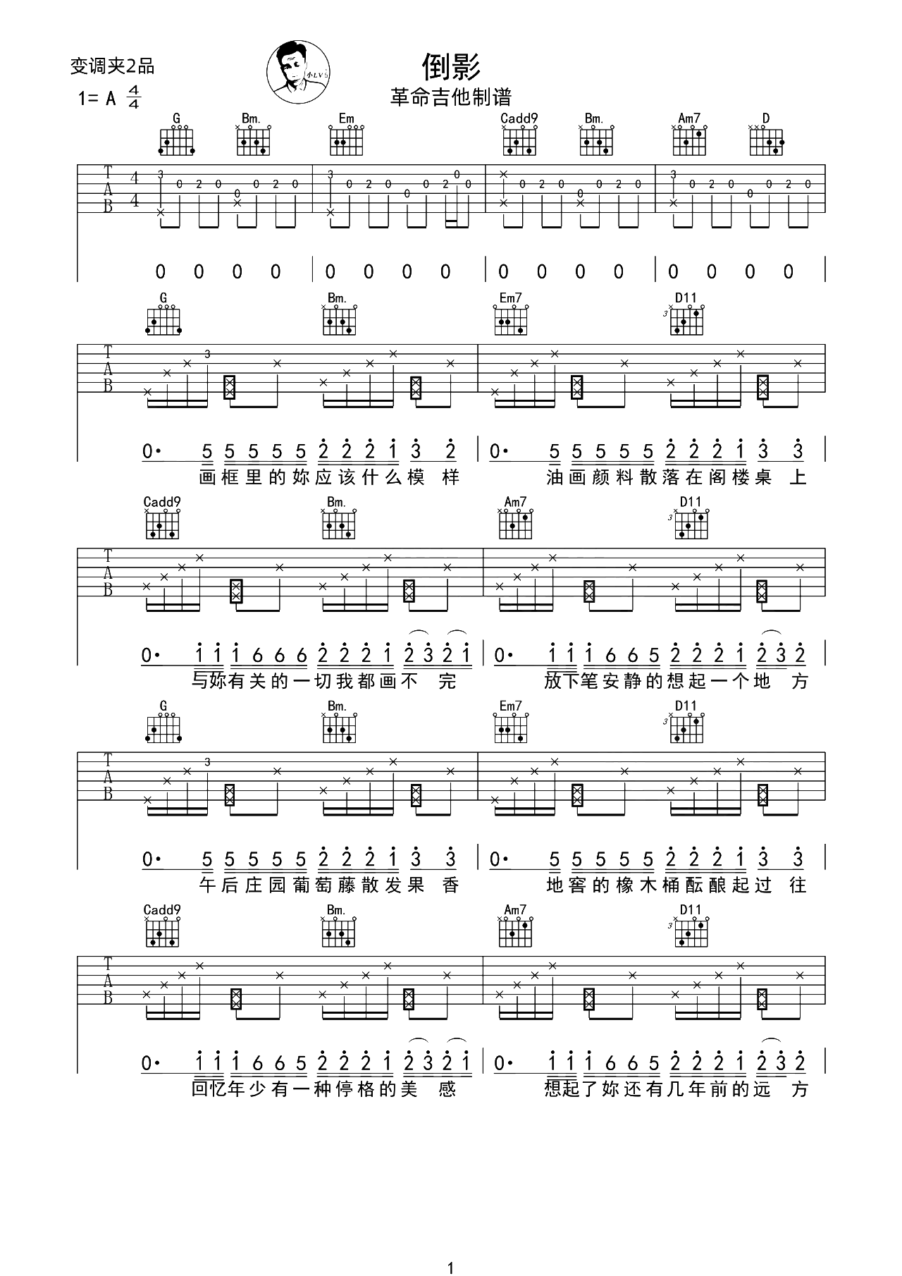 曲谱介绍: 周杰伦的《倒影》,依然出现热度持续上涨的趋势,许多人还认为歌曲风格上有点儿像《园游会》与《上海一九四三》的结合,连歌词都相差不大,也许很多人不太能接受大的改变,但早期杰伦的味,还是大家比较喜欢和熟悉的感觉。 《倒影》吉他谱,周杰伦演唱的歌曲,《倒影》吉他弹唱谱,选用G调指法,原调A调,CAPO夹2品弹唱,含前奏按原版编配,右手节奏涉及到拍弦的技巧,难度:5级适中。 《倒影》的其他优质版本曲谱推荐
