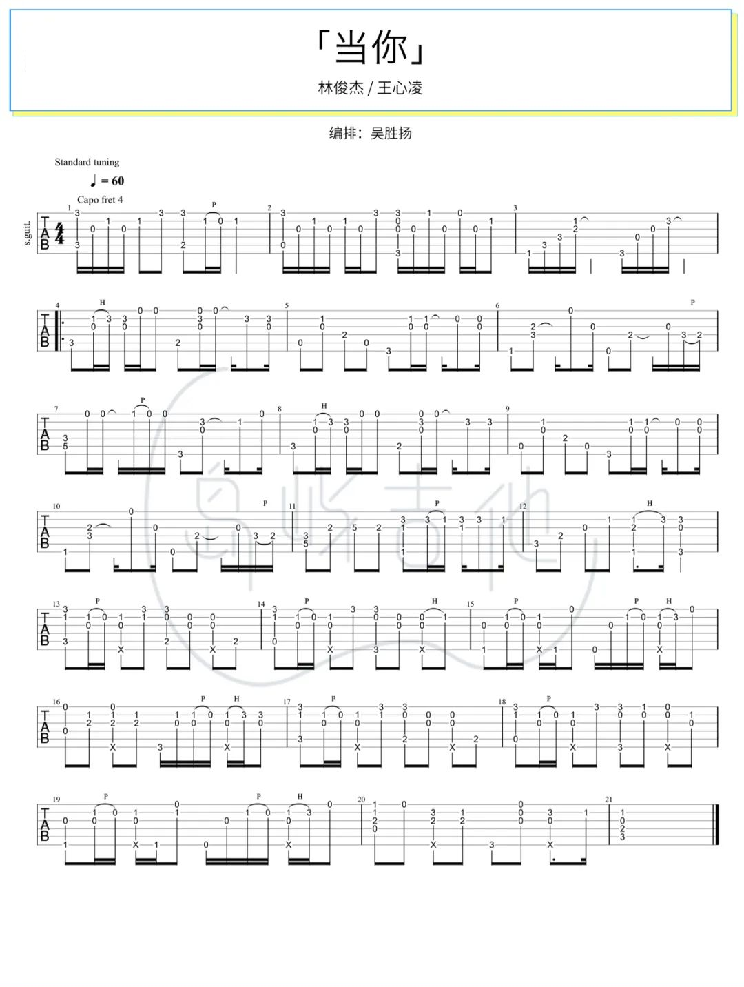 曲谱介绍: 当你指弹吉他谱,根据王心凌/林俊杰演唱的《当你》所改编的指弹吉他曲目,温柔的调调诠释着恋爱时分的羞涩朦胧,甜甜的味道,每当听到如此旋律,想念充斥着大脑,仿佛感觉又回到了恋爱中。 当你指弹谱,速度控制在60拍每分钟,节奏4/4拍,指弹部分有少量的勾弦和击弦,曲谱不算太长,附点部分注意好节奏顿挫,随谱附指弹演示和教学视频,大家可作参考。 指弹谱详情
