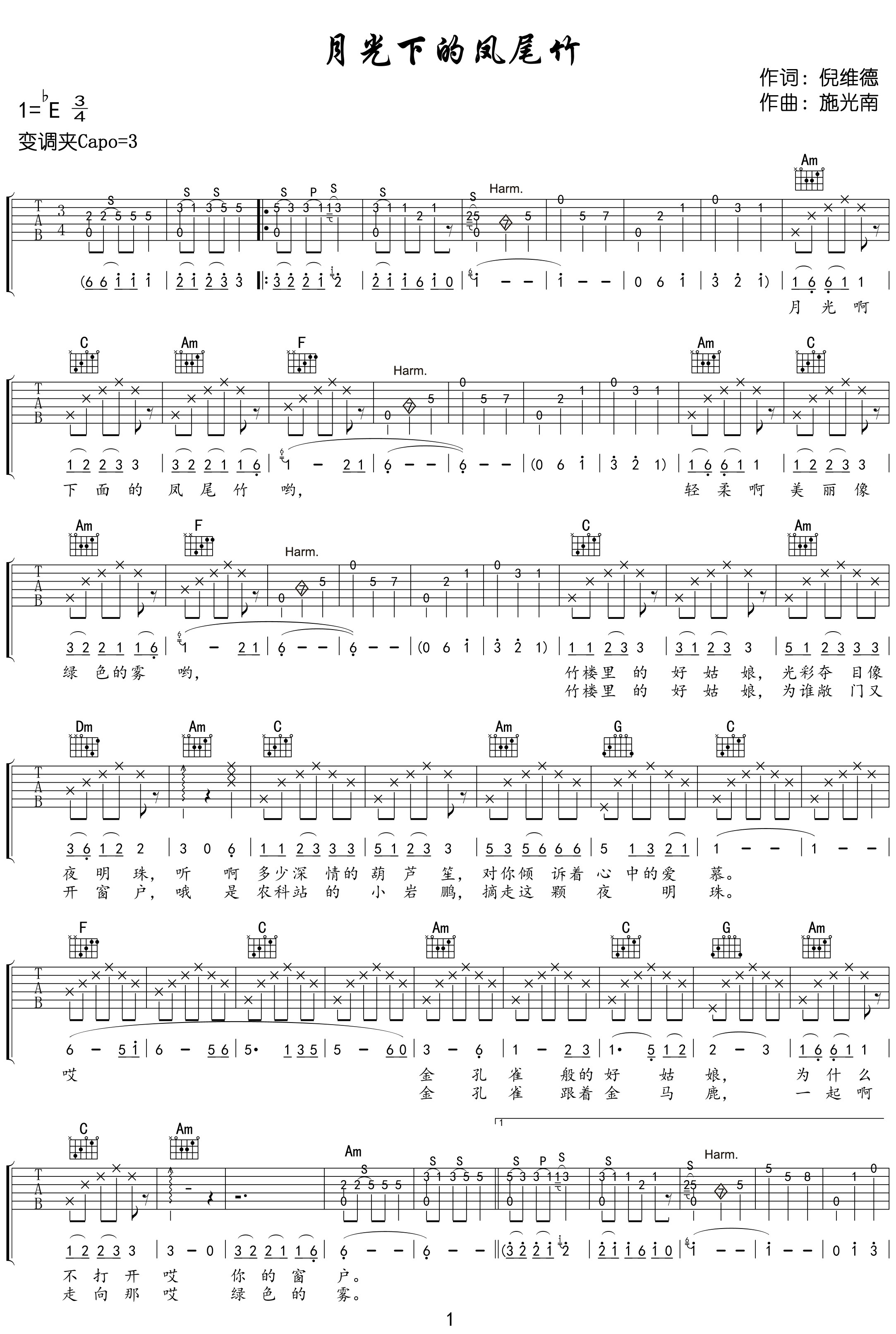 曲谱介绍:   月光下的凤尾竹吉他谱,来自傣族的民谣曲子,在月光柔美之下,悠扬的弦乐娓娓道来,怡然而舒适的感觉扑面而来,许多闻名的歌唱家都演唱过这首曲子,诠释出了一副令人动容的景象。 《月光下的凤尾竹》吉他弹唱谱,选用G调指法,原调bE,随谱附弹唱示范音频,男生演示CAPO夹3品弹唱原调,节奏3/4拍,含完整的前奏/尾奏,按原版编配,弹唱难度:6级适中。