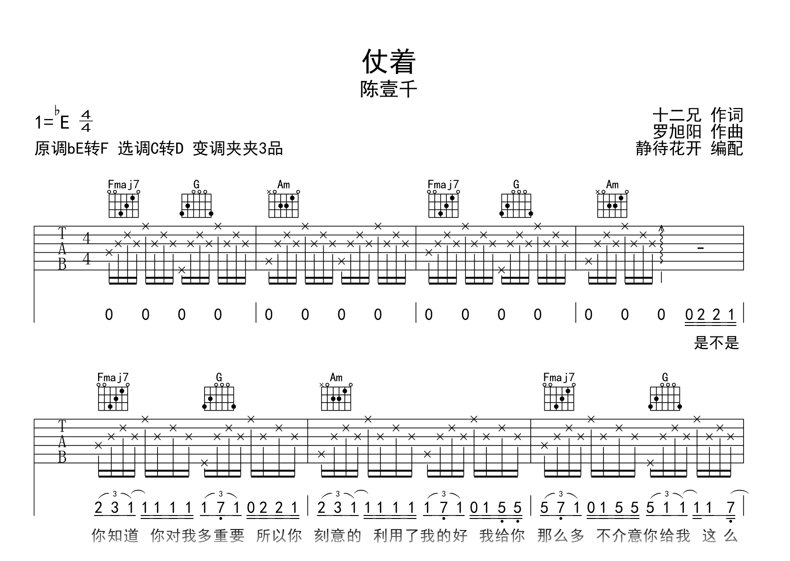 曲谱介绍: 仗着吉他谱,陈壹千演唱,送给曾经我失去和失去我的人。《仗着(你就仗着我爱你)》吉他弹唱谱,编配制谱采用C转D调和弦,变调夹夹第3品,原调bE转F调,琴友们也可以根据自己嗓音选择变调夹,速度大概80拍每分钟,演奏难度简单。 你的坏你的好,你一切我视若是珍宝,对你来说我不重要,可是我 习惯了礼貌旁观你所有微笑,你就仗着我对你那么好…