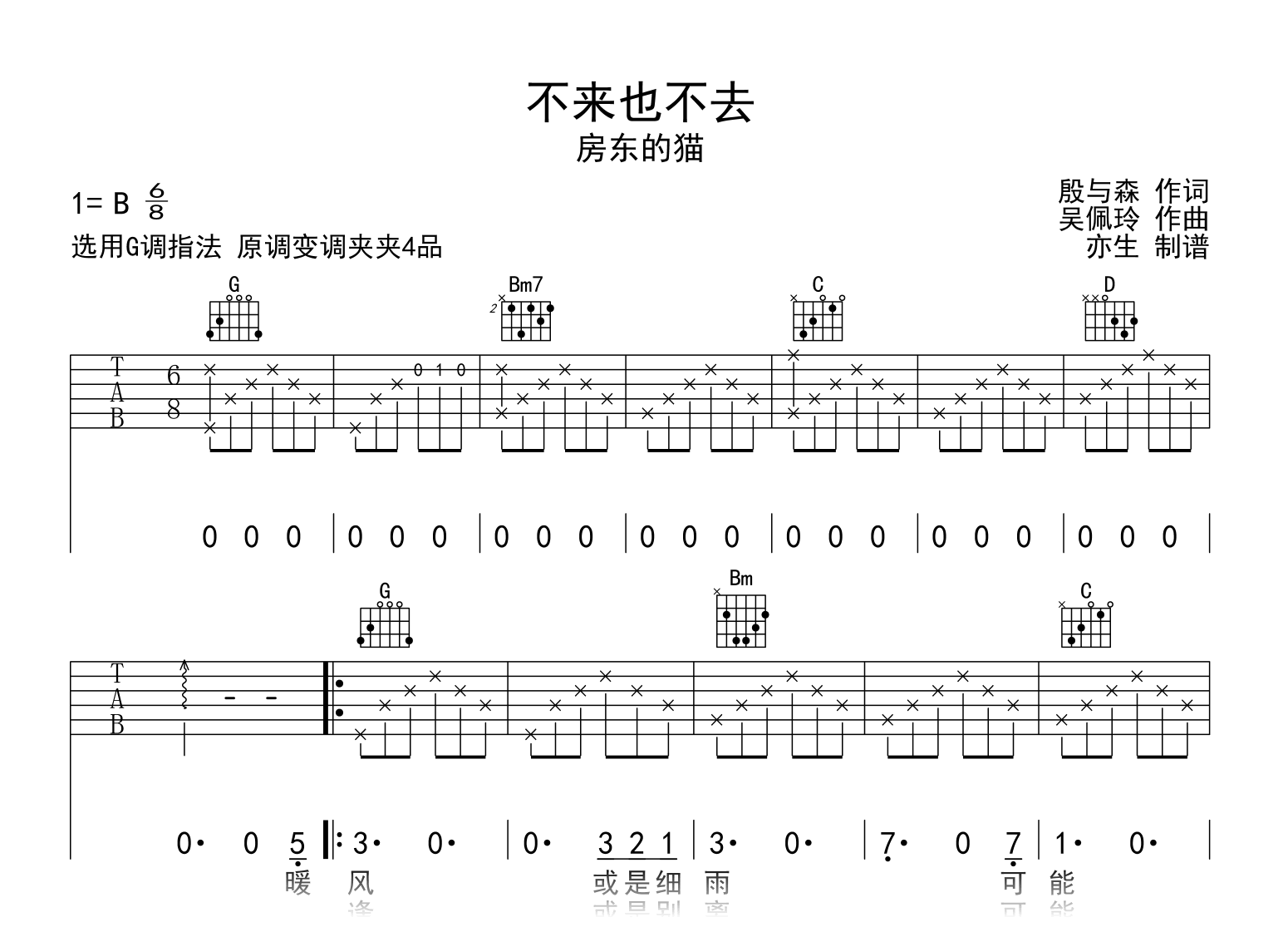 曲谱介绍: 不来也不去吉他谱,房东的猫的演唱,我们可以来去自由,也可以爱恨随意。《不来也不去》吉他弹唱谱,原调B,选用G调和弦指法演奏,变调夹夹第4品,节奏6/8拍,速度大约每分钟95拍,演奏难度为简单。 房东的猫第四张全新创作专辑《世界/青年》首发曲目《不来也不去》,生活有时像一座重山。但希望我们更多感受生活中的轻盈。