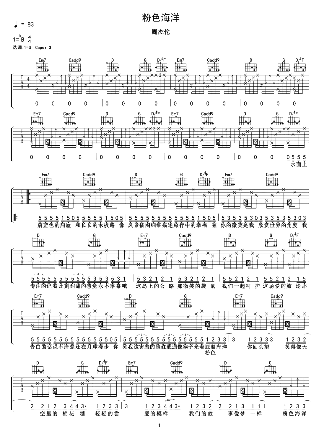 曲谱介绍: 《粉色海洋》吉他谱,周杰伦演唱。 《粉色海洋》吉他弹唱谱,G调指法,CAPO夹3品弹唱原调,节奏4/4拍,速度83BPM,按原版精编,含完整前奏,弹唱难度:6级适中。