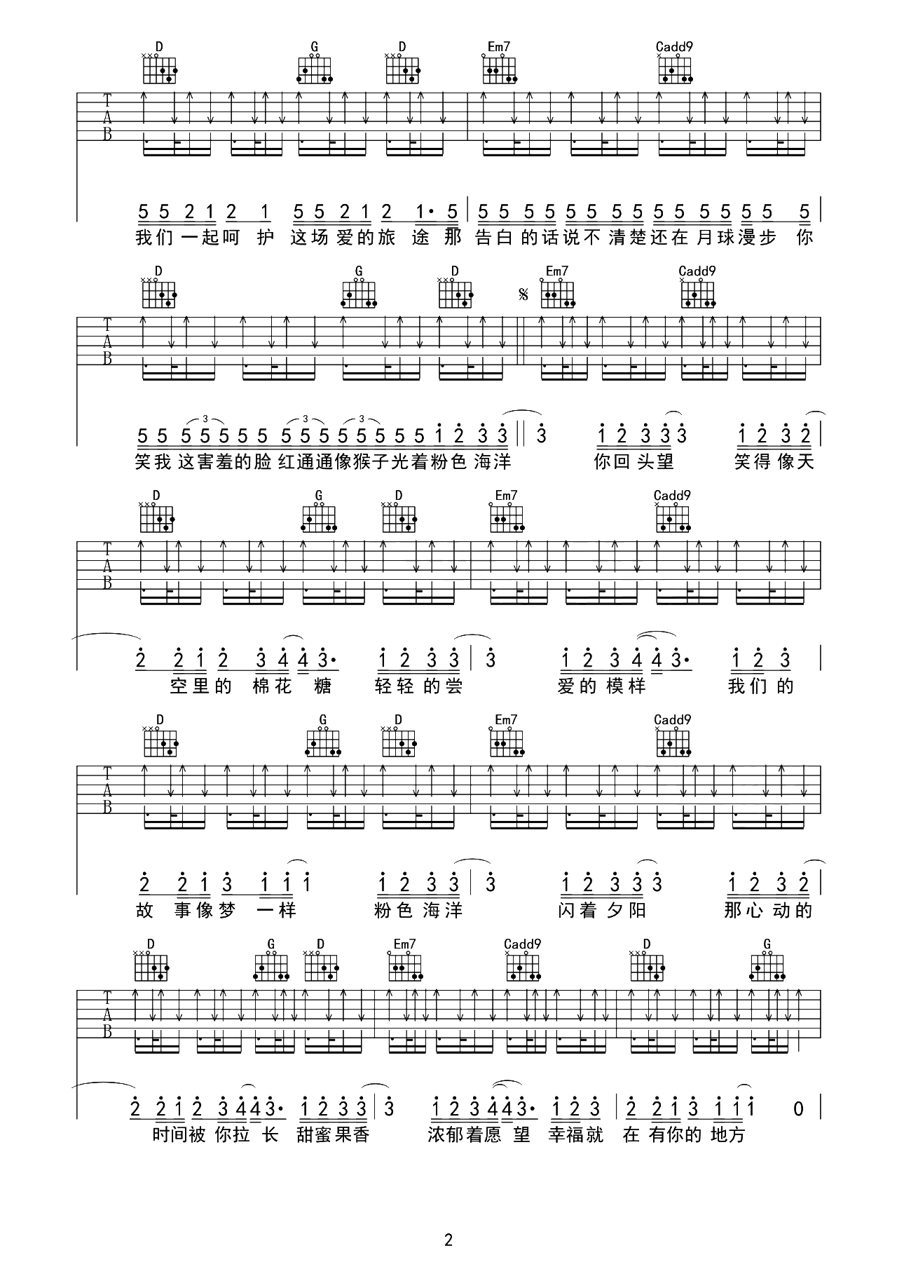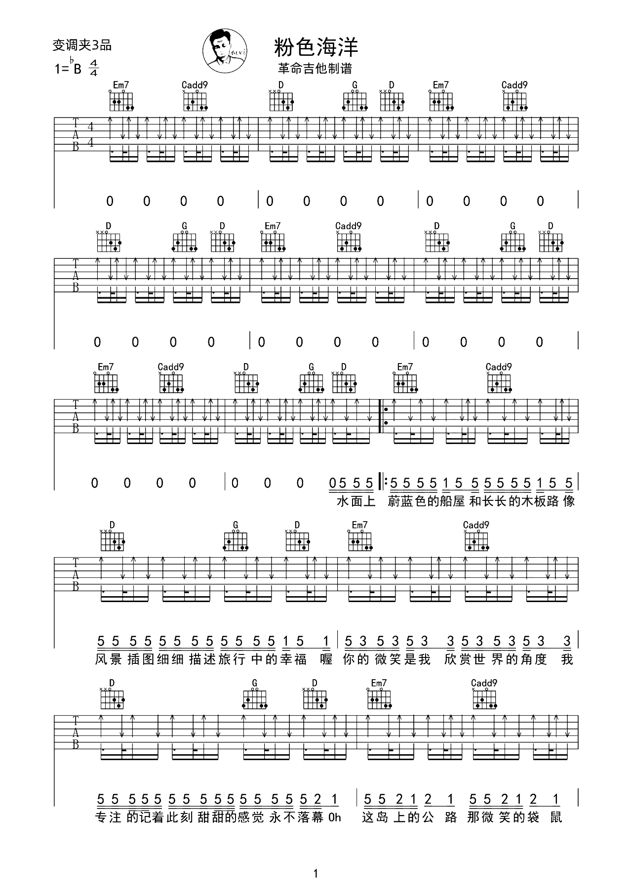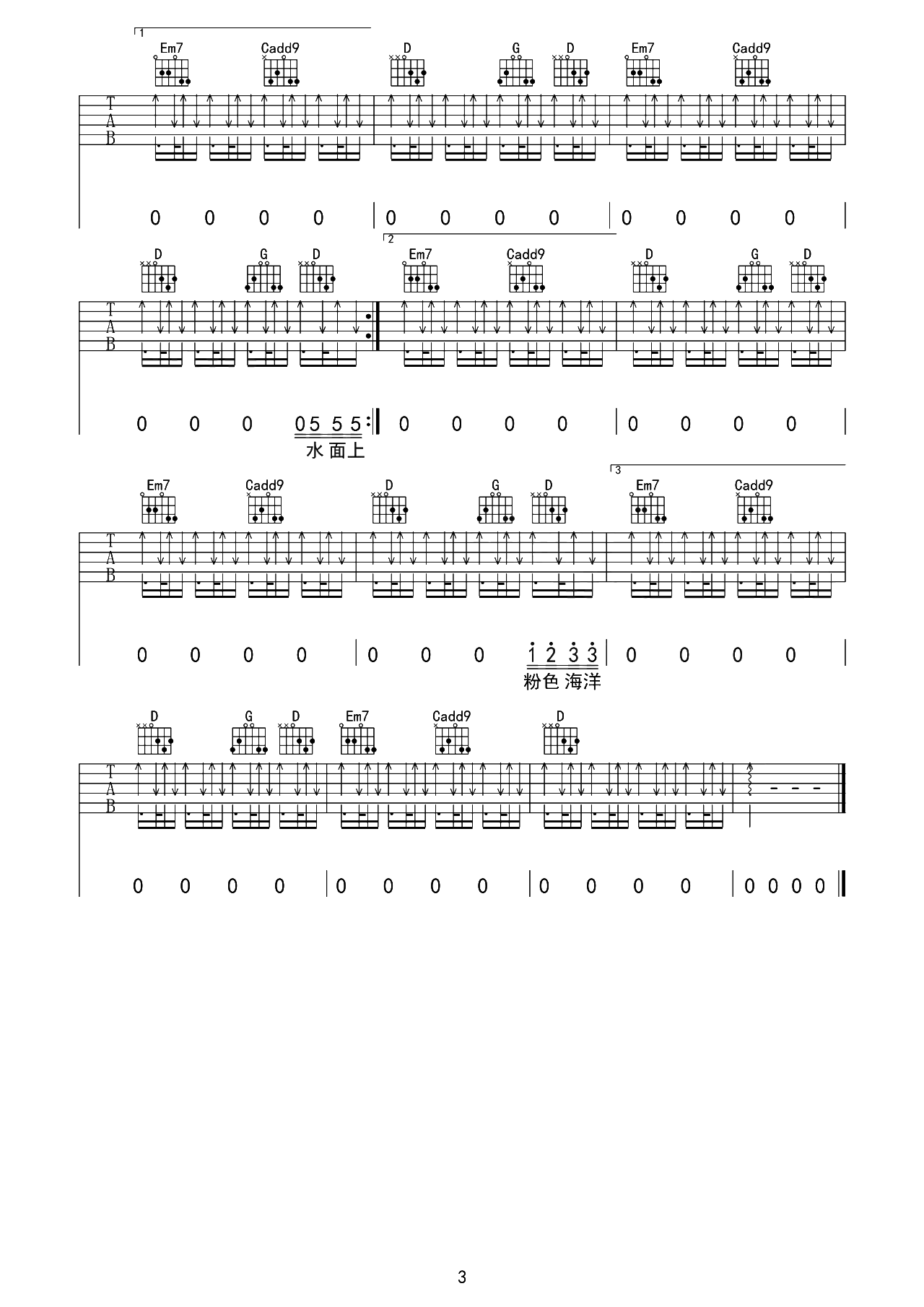 曲谱介绍: 《粉色海洋》吉他谱,方文山作词,周杰伦作曲并演唱的歌曲。 《粉色海洋》吉他弹唱谱,选用G调指法,原调bB,CAPO推荐夹3品弹唱原调,全曲扫弦节奏编配,难度:5级适中。