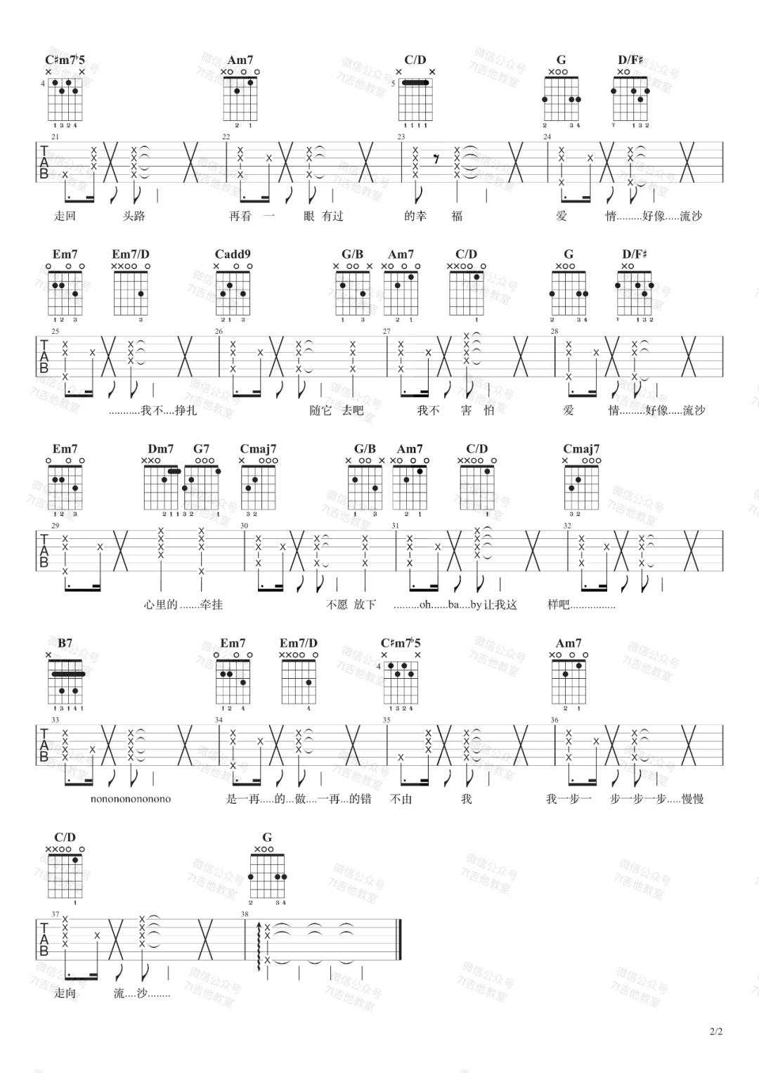曲谱介绍: 流沙吉他谱,陶喆早期的一首R&B伤感情歌,用婉转深情的嗓音诠释出人们的心酸与悲落,许多人的感情就如同指缝中的细沙,总是越想握紧却跑得越快。 《流沙》吉他弹唱谱,选用G调指法,原调bA,节奏4/4拍,速度75拍每分钟,随谱附《流沙》吉他弹唱演示视频,难度:6级适中。