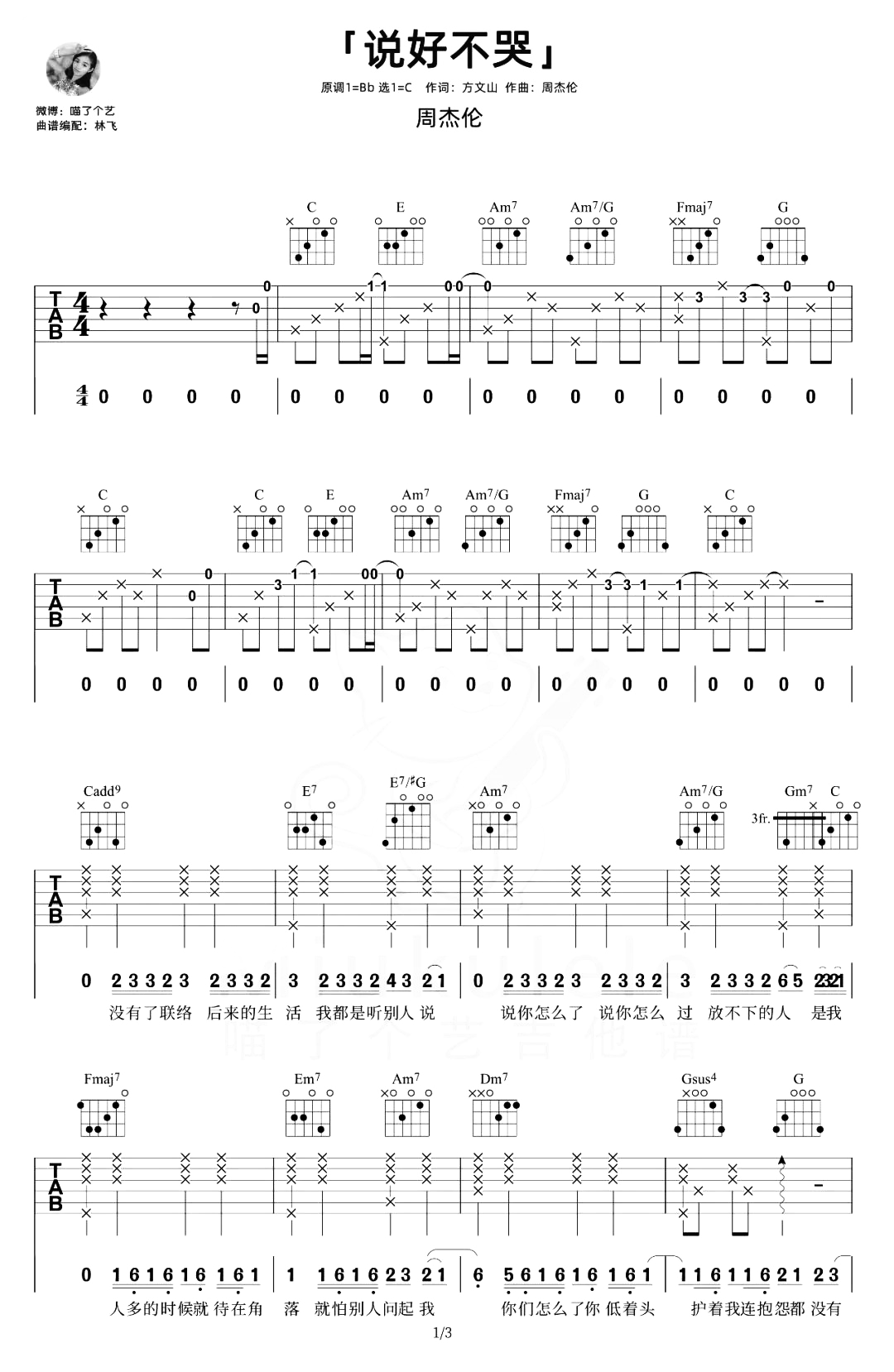 曲谱介绍: 《说好不哭》吉他教学视频 说好不哭吉他谱,周杰伦作曲并演唱的歌曲,不甘心的失落充斥着糟糕的心情,所有的成全都是为了收好过去的约定,说好不哭,但也许内心藏不住的在流泪。 《说好不哭》吉他弹唱谱,选用C调指法,原调bB,本谱为女生版编配的调,比较推荐夹2-3品位弹唱,随谱附演示和教学视频,感兴趣的朋友不妨跟着练习。