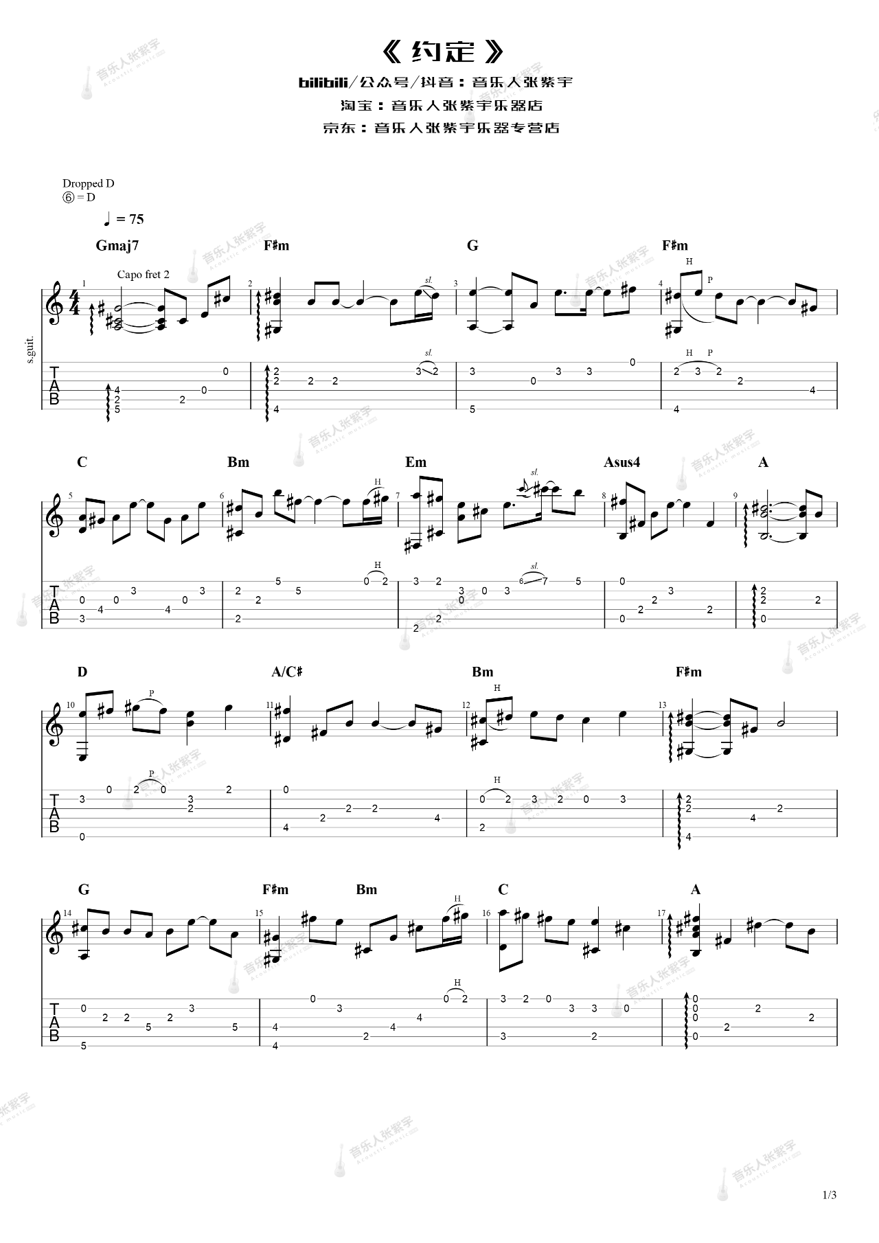 曲谱介绍: 《约定》指弹教学视频 约定指弹吉他谱,根据王菲/周惠演唱的歌曲所改编的指弹曲目,旋律非常舒缓优美,诠释着一些因为遗憾去憧憬着对方的幸福,让人共鸣而感慨。 《约定》指弹谱,速度控制在75拍每分钟,节奏4/4拍,随谱附有相关的演示/教学视频,可供大家参考,指弹难度:3级较简单。 指弹谱详情