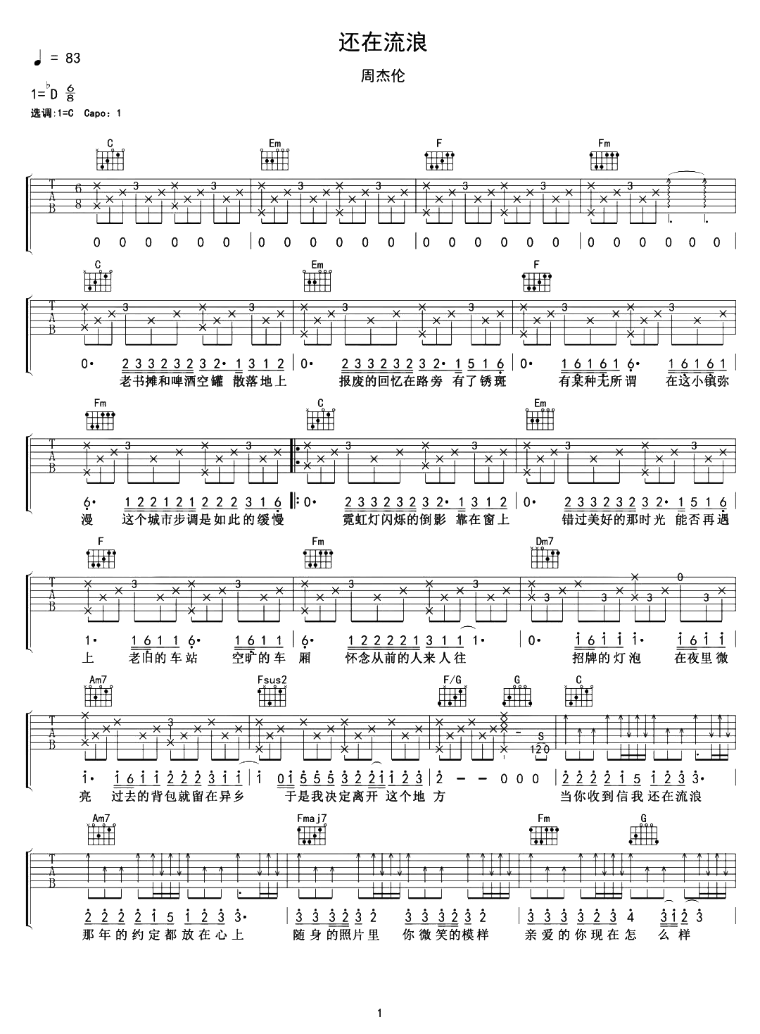 还在流浪吉他谱 - 周杰伦 - C调吉他弹唱谱 - 原版