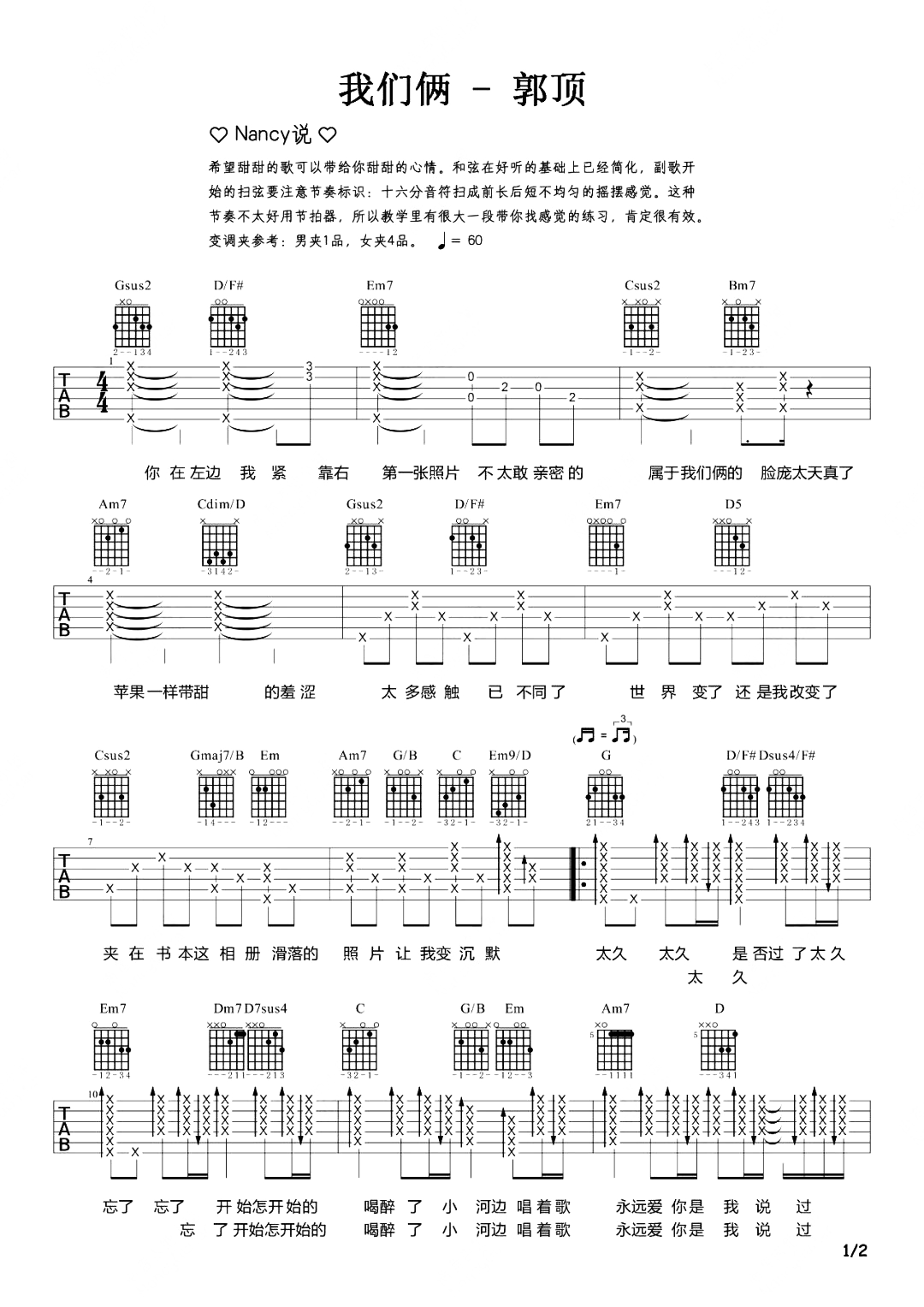 曲谱介绍: 《我们俩》吉他教学视频 《我们俩》吉他谱的其他优选版本 我们俩吉他谱,郭顶原唱的一首抒情歌曲,以一种温馨甜蜜的方式,透视着关于“我们俩”的情感路途,那些难忘而甜蜜的点滴片段,似乎温暖了每一个人的心室,体会到了甜甜的气息。 《我们俩》吉他弹唱谱,本谱以女生版进行编配,男生夹1品,女生可夹4品变调夹进行弹唱,速度控制在60拍每分钟,节奏4/4拍,弹唱难度3级较简单。