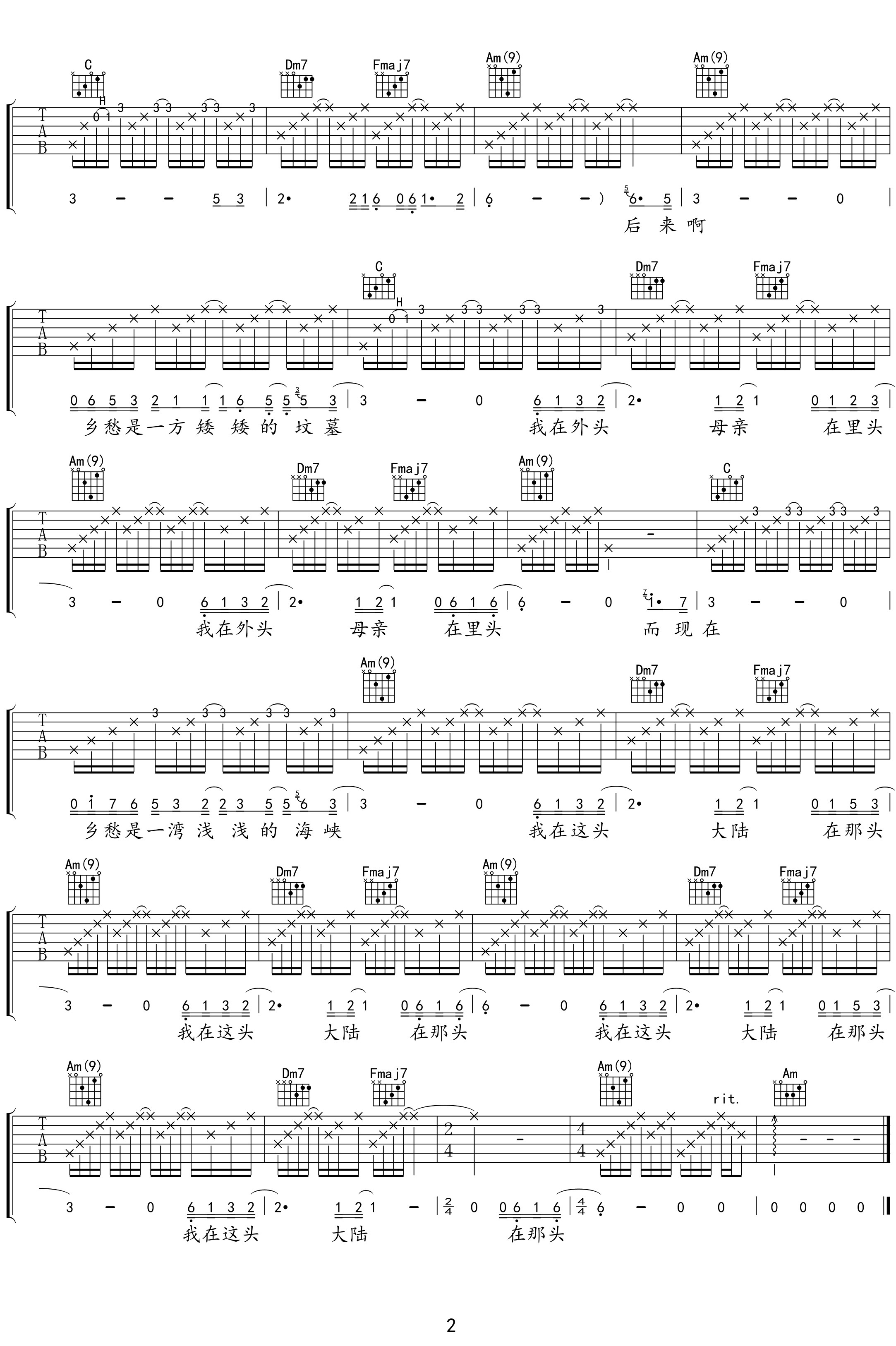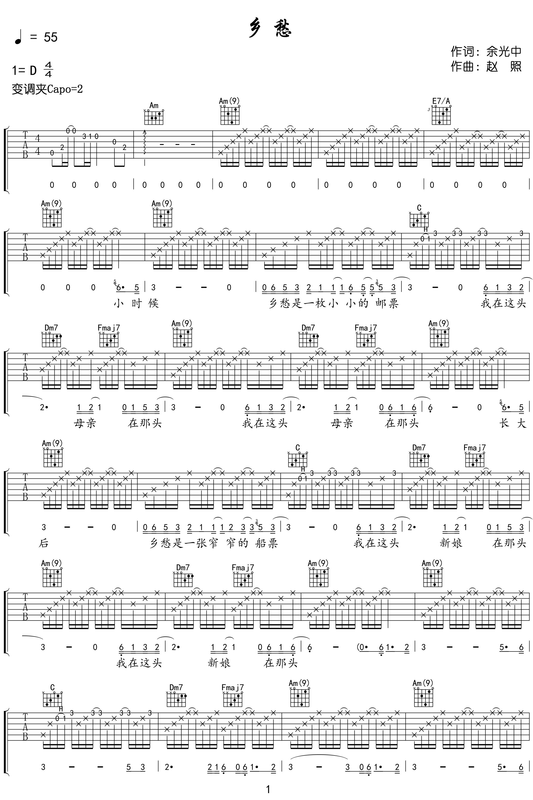 曲谱介绍:   乡愁吉他谱,赵照根据余光中先生的诗改编而成。当余光中先生的诗与赵照的音乐相融合的时候,它就是一把吉他,一束光,像月光一样透出淡淡的温暖和悲伤。 《乡愁》吉他弹唱谱,选用C调指法,原调D调,CAPO夹2品弹唱原调,节奏4/4拍,速度可控制在55拍每分钟,随谱附示范音频,感兴趣的琴友可参考试听。