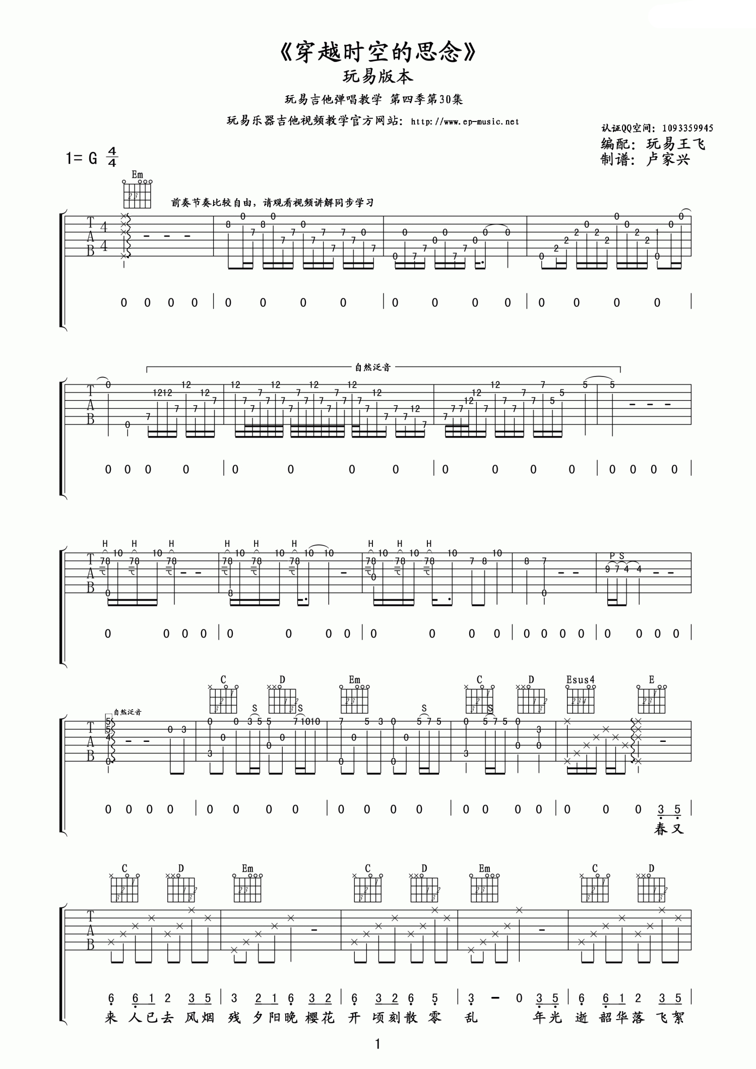 曲谱介绍: 《穿越时空的思念》吉他谱_G调吉他弹唱谱